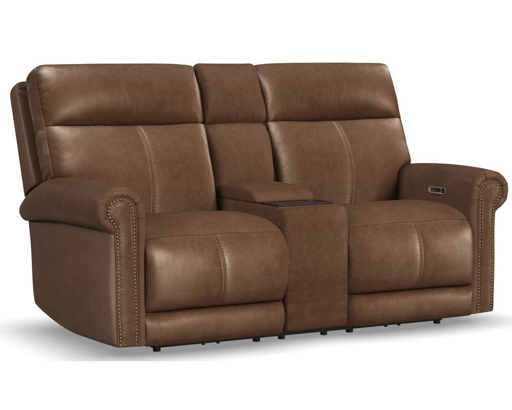 Meet the Alexander 1645 Triple Reclining Console Loveseat – a unique blend of traditional elegance and modern comfort. This loveseat is not just a piece of furniture, it's a statement of luxury for your living room. Its rolled arms, adorned with subtle nailhead trim, add a touch of sophistication to its timeless design.