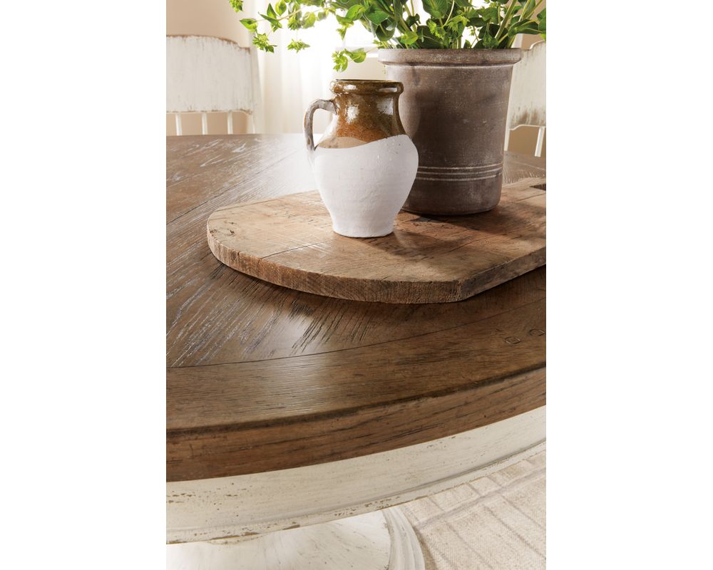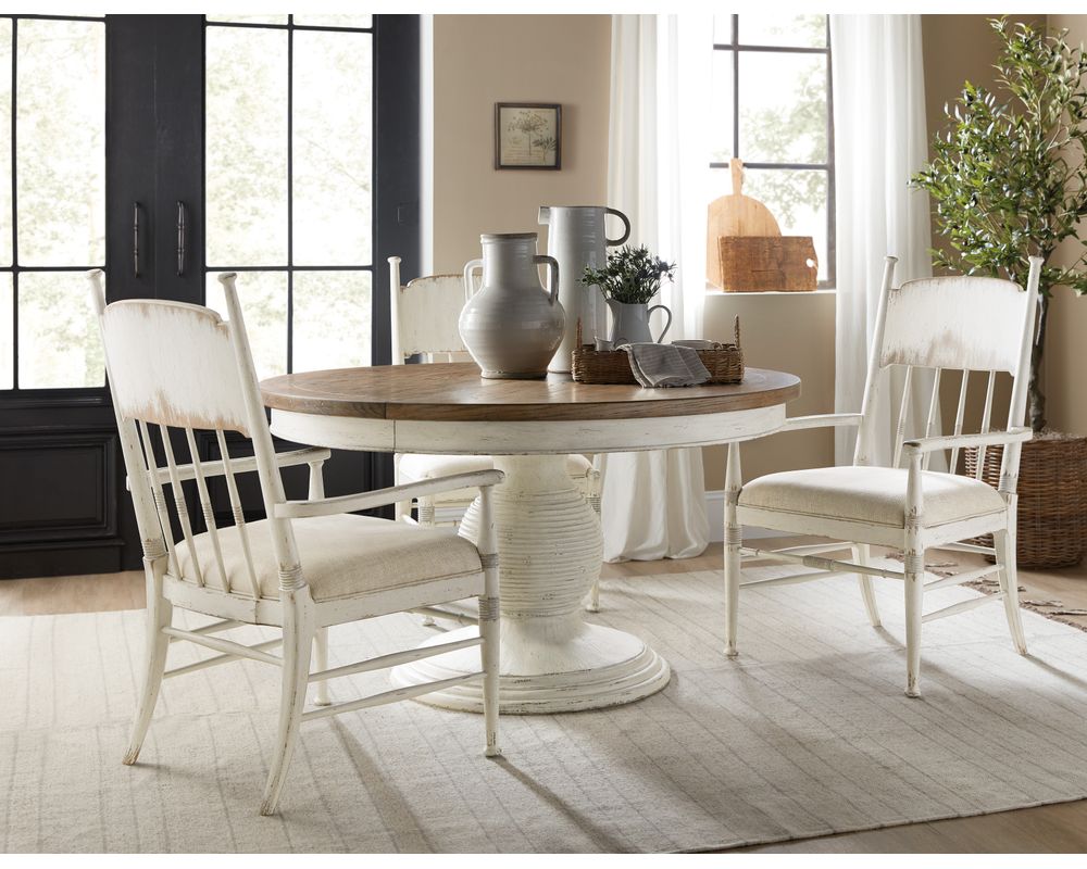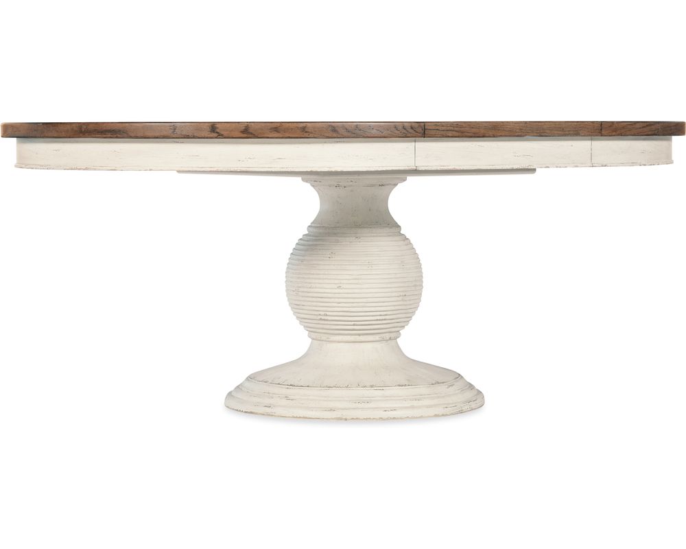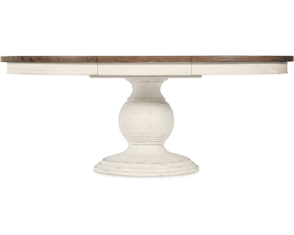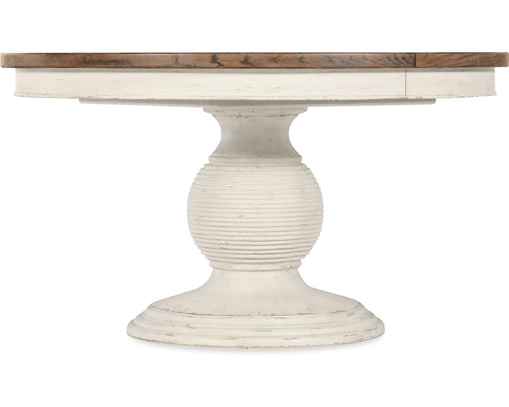 The Americana Round Pedestal Dining Table also boasts a beautifully carved pedestal base, adding a touch of sophistication and elegance to the overall design. To ensure stability and balance, the table comes with levelers to adjust the height on uneven floors.