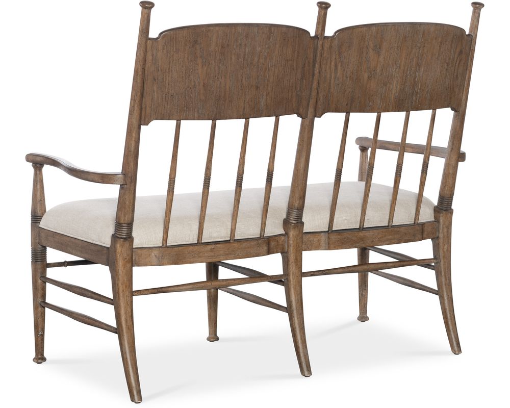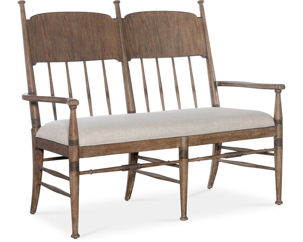 From Sofas and Sectionals.com: The Americana Dining Bench will introduce a touch of timeless elegance to your dining space. Crafted with a sturdy frame and charming spindle back, this bench is designed to provide both style and comfort. The seat is upholstered in a beautiful biscuit-colored Performance Fabric, known for its durability and easy maintenance. The welt trim adds a subtle touch of sophistication to the overall design.