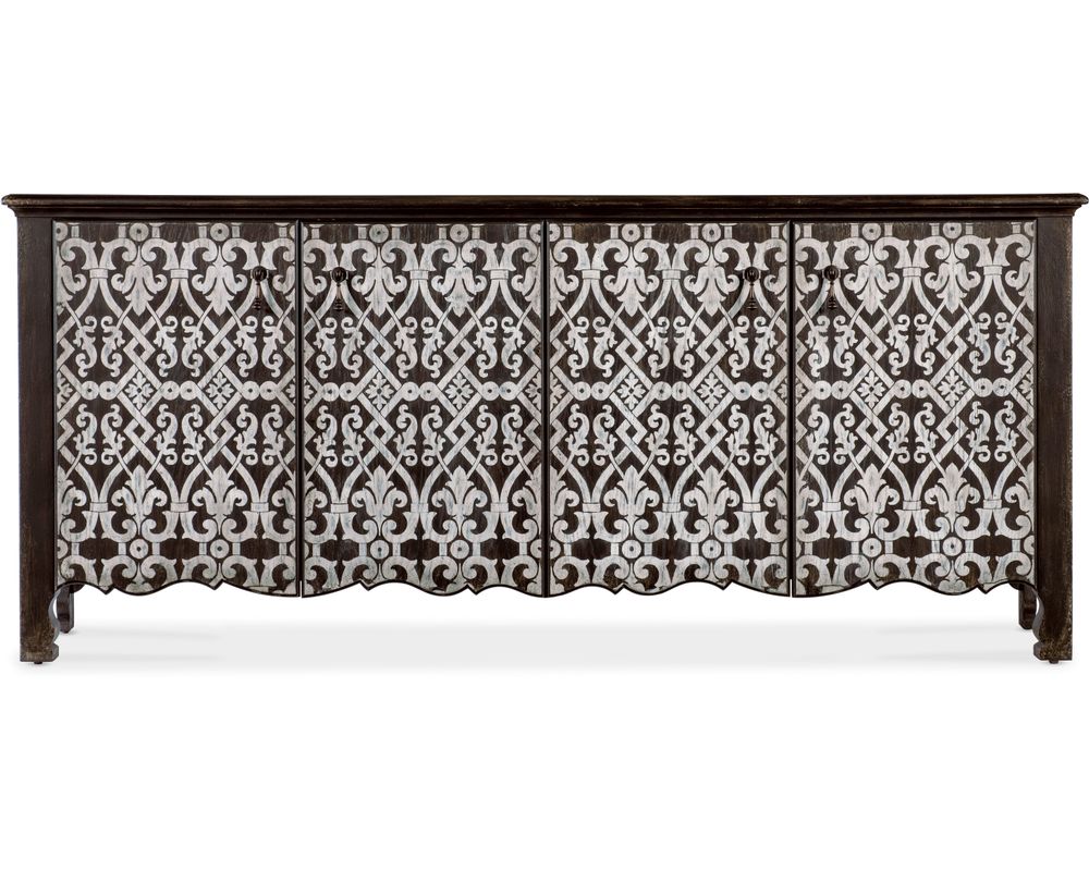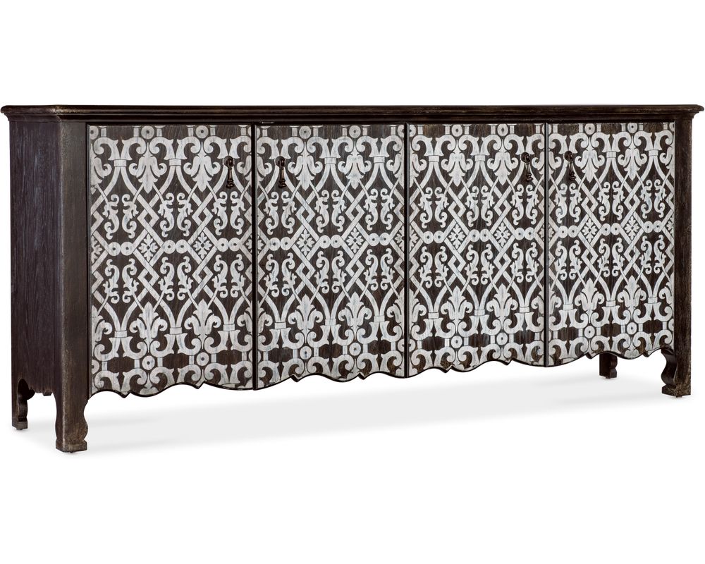 Crafted with oak veneers and a solid-wood edge top, this credenza is durable and elegant. The Molasses finish adds a touch of warmth to any room, while the color variations highlight the natural beauty of the wood. The carved door fronts and scroll accent on the base add a touch of sophistication to the overall design.