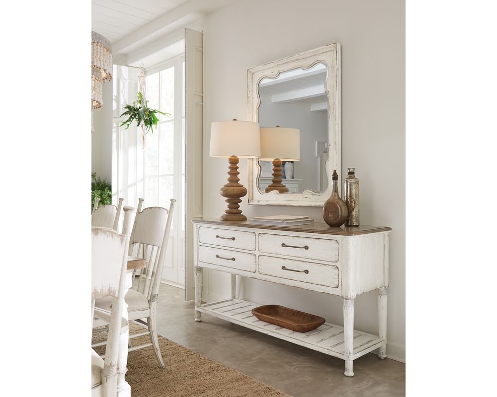 The Americana collection celebrates our rural roots and embodies a simpler era's charm, resilience, and organic splendor. By reimagining historical pieces and incorporating fresh finishes, functions, hardware, and forms, this collection offers a range of bedroom, dining, entertainment, accent, and occasional items that strike a timeless balance between history and the environment. Americana is made with oak veneers and has three main finishes - Daisy, Honey, and Molasses - and various accent finishes adorned with decorative artwork. The collection also boasts design elements such as parquet tabletops, two-tone finishes, arched architectural details, seeded glass, and antique mirrors. The hardware options include classic bale-style and hand-hammered metal pieces featuring a muted brass tone finish.