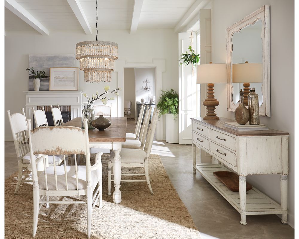 The Americana collection celebrates our rural roots and embodies a simpler era's charm, resilience, and organic splendor. By reimagining historical pieces and incorporating fresh finishes, functions, hardware, and forms, this collection offers a range of bedroom, dining, entertainment, accent, and occasional items that strike a timeless balance between history and the environment. Americana is made with oak veneers and has three main finishes - Daisy, Honey, and Molasses - and various accent finishes adorned with decorative artwork. The collection also boasts design elements such as parquet tabletops, two-tone finishes, arched architectural details, seeded glass, and antique mirrors. The hardware options include classic bale-style and hand-hammered metal pieces featuring a muted brass tone finish.