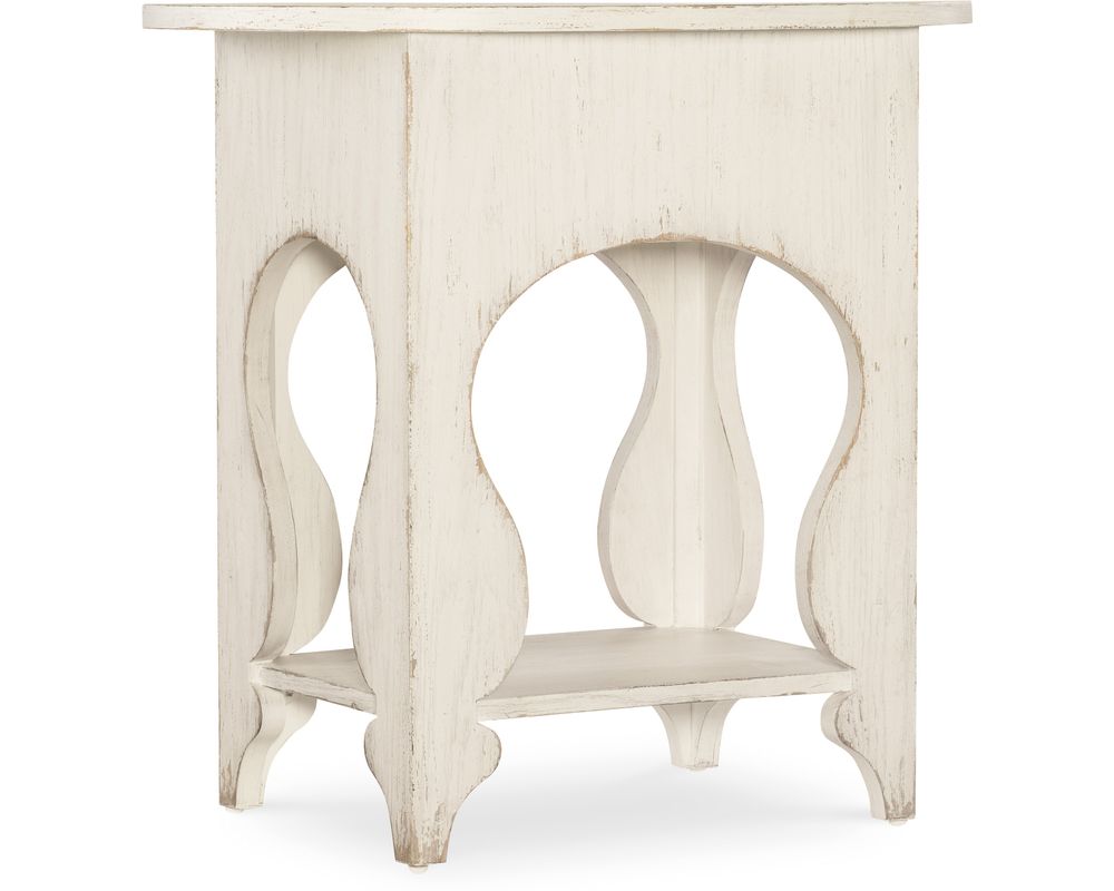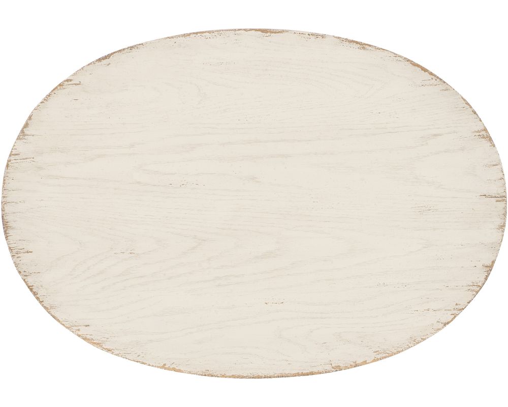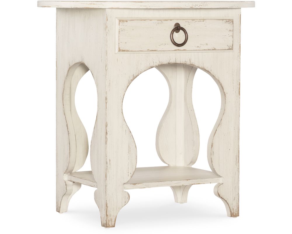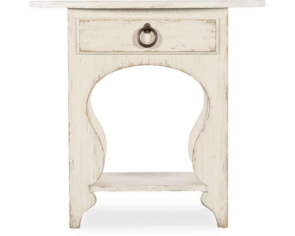From Sofas and Sectionals.com: Introducing the Americana One-Drawer Oval Nightstand, a charming addition to any bedroom. This nightstand features a unique oval shape and shapely carved legs, giving it a distinct and elegant appearance. The time-worn white finish on the cathedral oak veneers adds a vintage charm, making it a perfect fit for various decor styles.