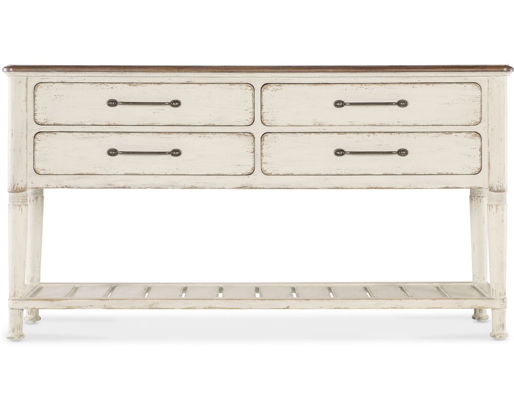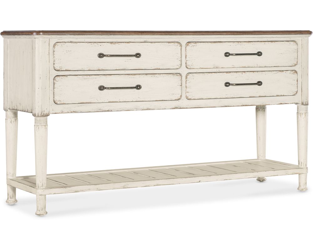 The Americana Dining Server is a testament to quality craftsmanship. It is made with oak veneers and a solid-wood edge top, ensuring durability and longevity. The Americana Daisy finish, a beautiful time-worn white finish, brings out the natural wear and character of the oak veneers. The Americana Honey finish, with its gentle and warm brown tone, adds just the right amount of distressing to give it a vintage feel.