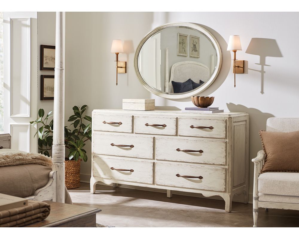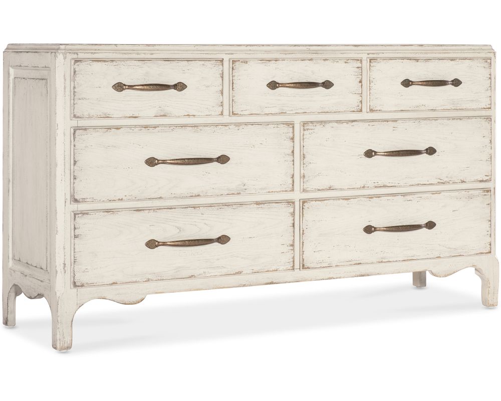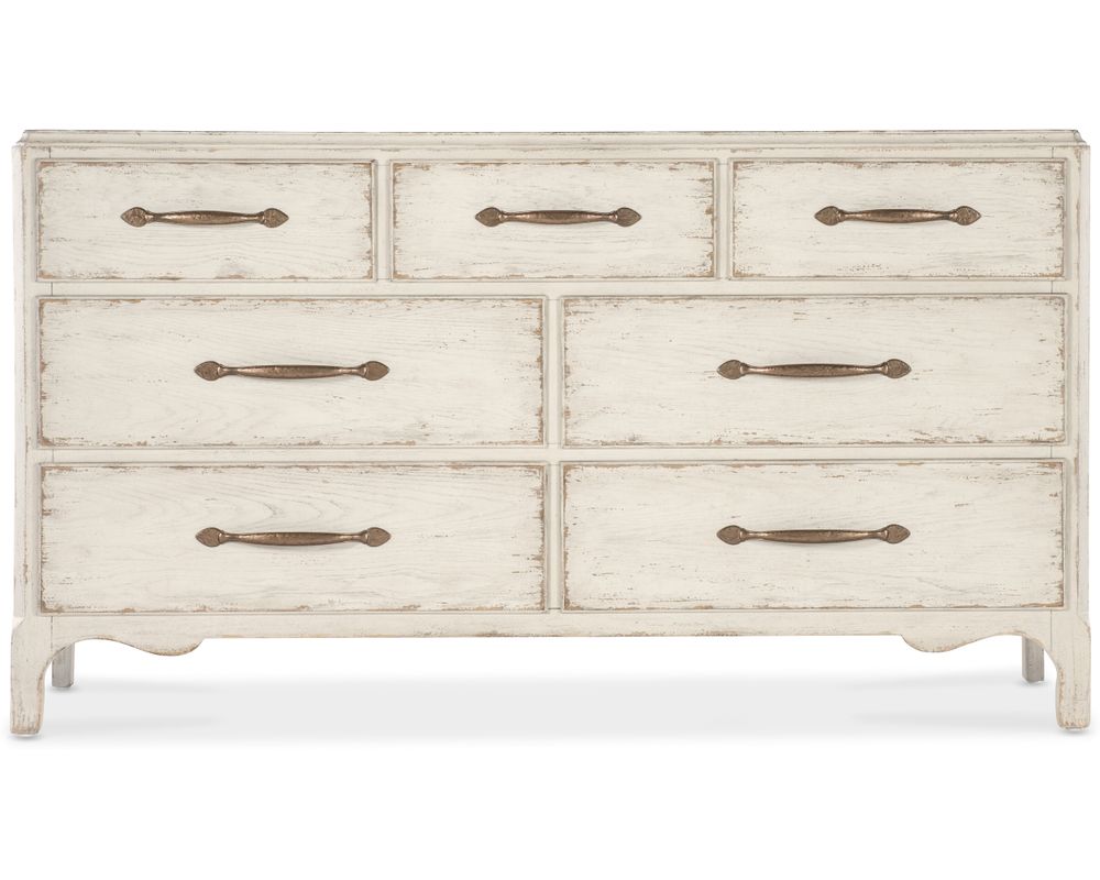 The Americana Seven Drawer Dresser is not only functional but also visually appealing. Its Daisy finish, a time-worn white finish on cathedral oak veneers, gives it a charming vintage look. This finish showcases the natural wear and tear that one might expect from a piece of furniture passed down through generations, revealing the rich oak character beneath. The metal alloy pulls in an antique bronze finish, which adds the perfect finishing touch, giving this dresser a hint of old style.