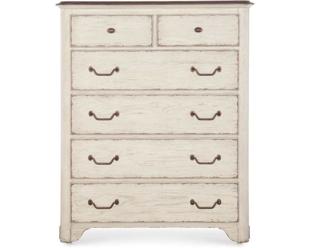 Crafted with high-quality materials, this chest is made of oak veneers with a solid-wood edge top for durability and sturdiness. The metal alloy drawer pulls in an antique bronze finish, adding a vintage touch to the chest's design. The Americana Six Drawer Chest is perfect for those who appreciate classic and timeless furniture.