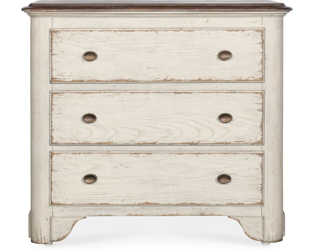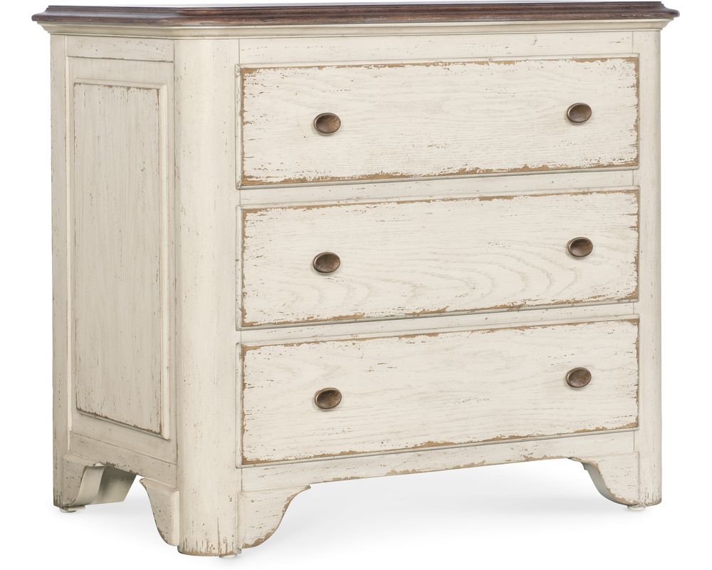 The Americana Three-Drawer Nightstand is perfect for those who appreciate a casual and laid-back style. The distressed finish and antique bronze metal alloy pull give it a charming old-world appeal, making it a perfect addition to any bedroom decor.