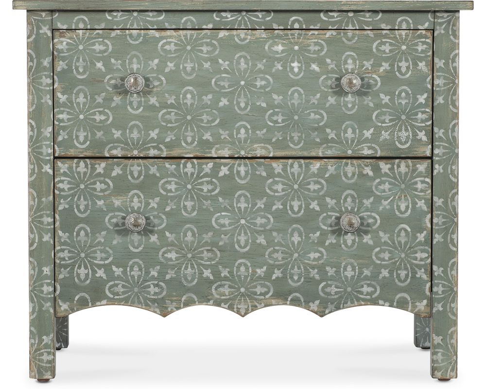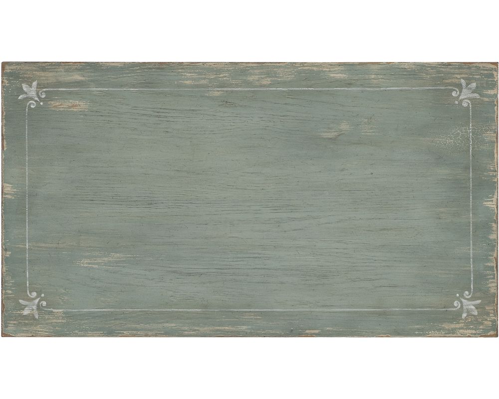 One of the standout features of this nightstand is its stunning antique green finish. With distressed and rub-through detailing, this finish adds a touch of vintage charm to the piece. The nightstand also features a white finished scroll pattern, adding a subtle yet eye-catching element.