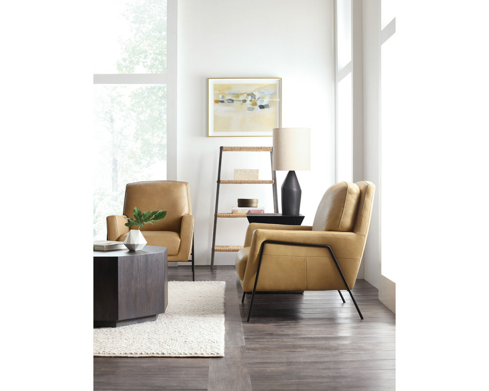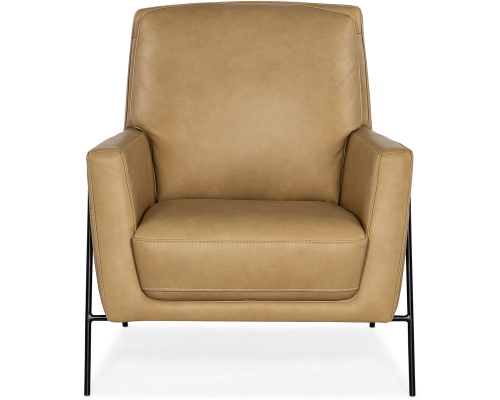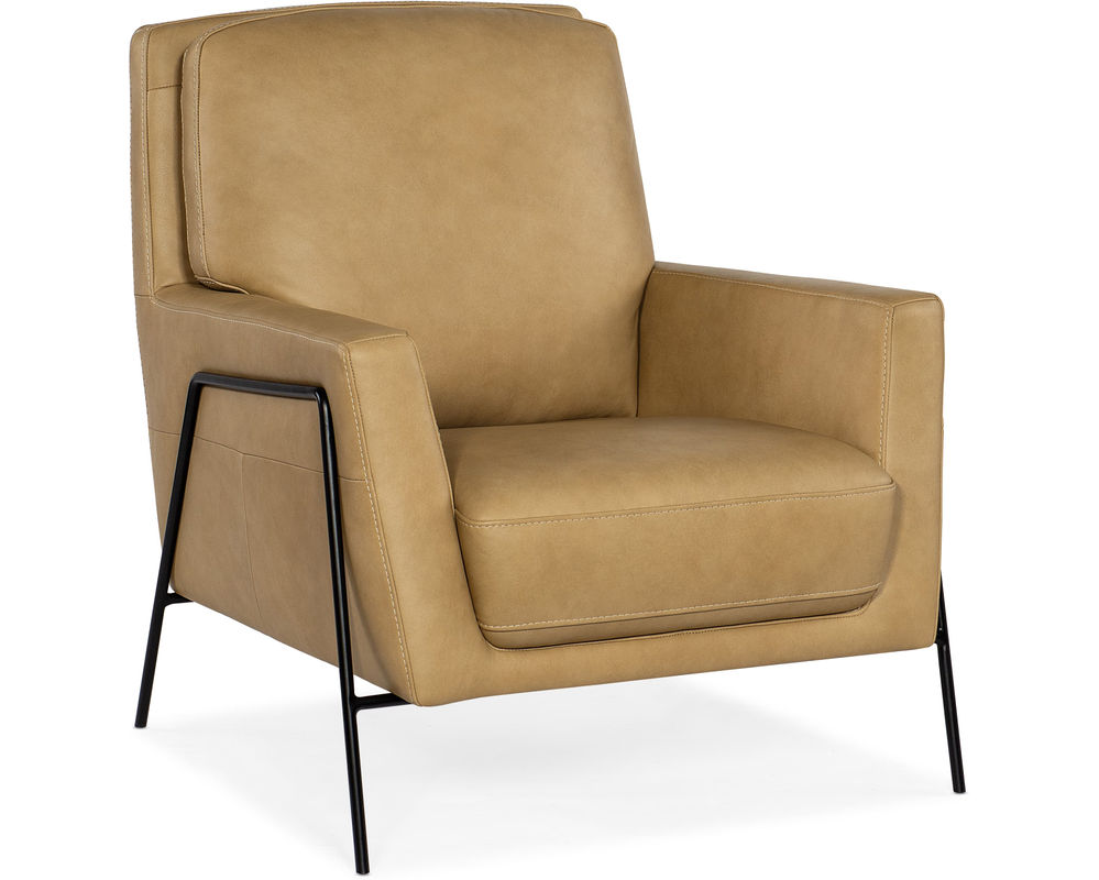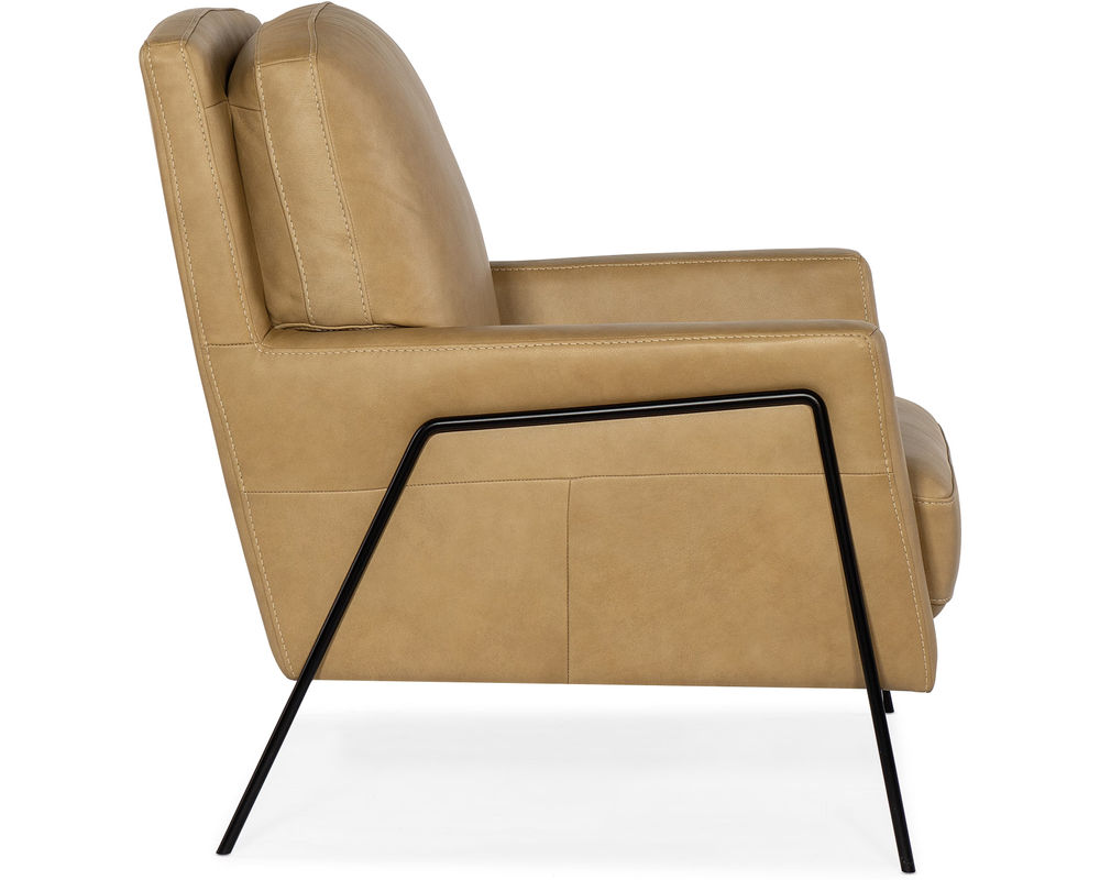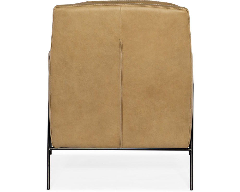 Swanky and stylish, the Amette Club Chair blends sleek design with upscale comfort. Its sculptured silhouette is supported by a slender black metal frame and upholstered in luxurious Anker Sand top grain leather — a stunning statement for any modern space.