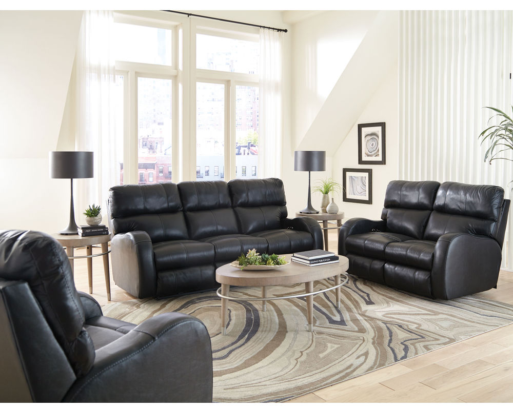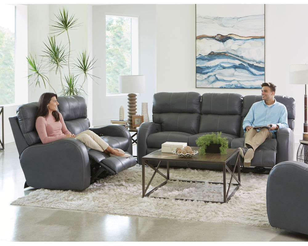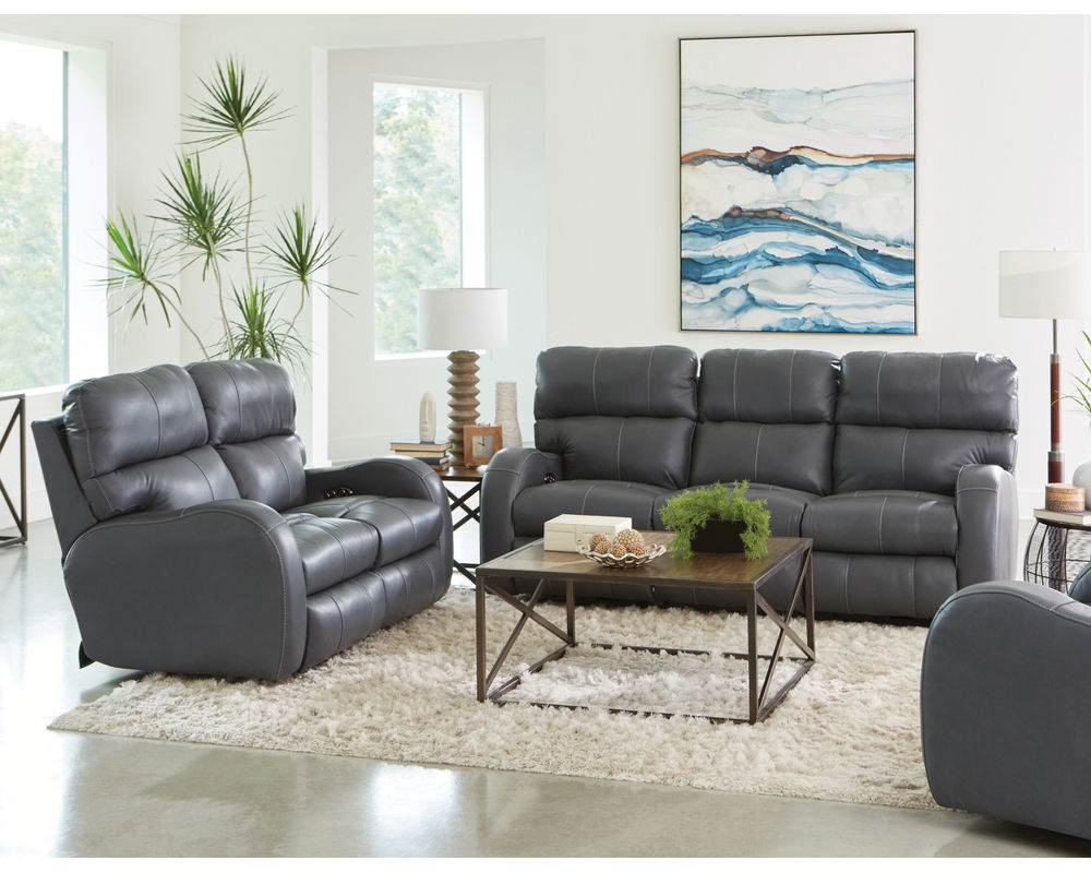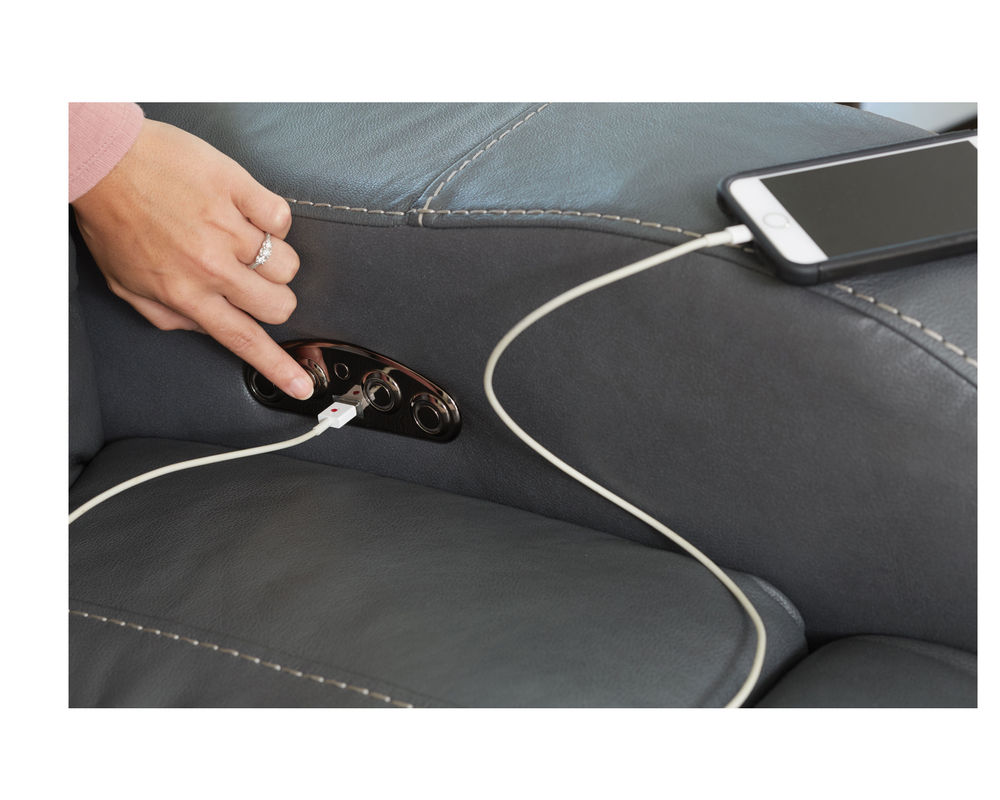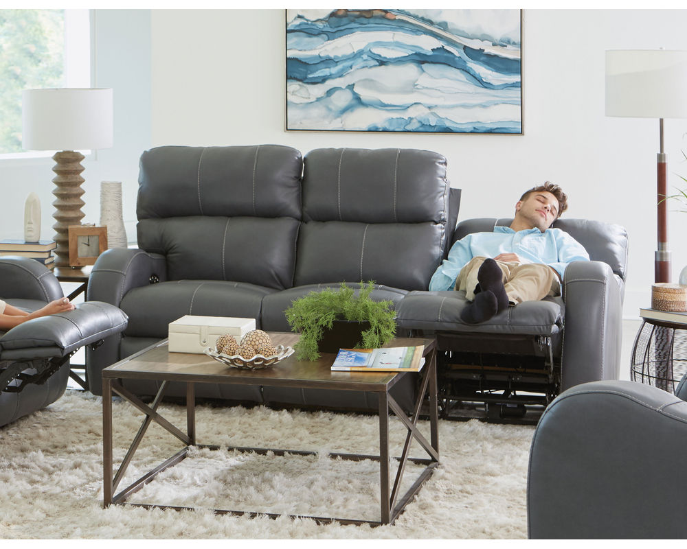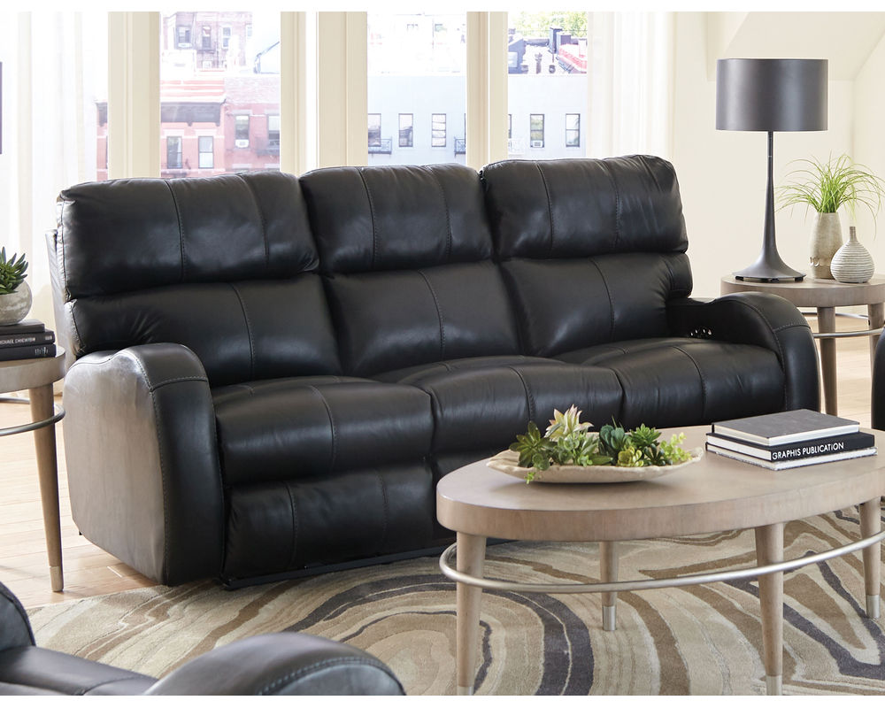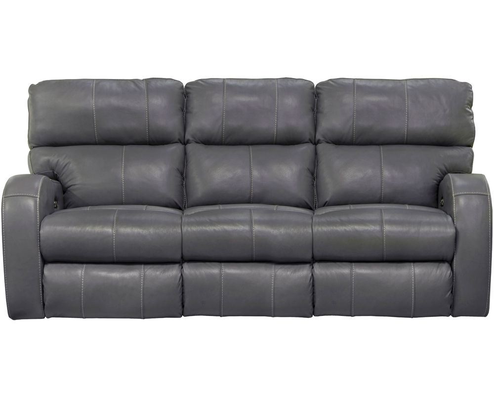 The Angelo Leather Reclining Sofa with Power Headrest and Power Recline with USB Charging is the ultimate in comfort and style. This reclining sofa is upholstered in top grain leather, which is soft and luxurious to the touch, and features pub back, pad-over chaise, and contrasting stitching for added style and comfort. Choose from either black or gunmetal leather colors to match any decor. With power headrest and power recline, you can relax into the perfect position, and USB charging ports let you keep your electronic devices charged while you relax. Enjoy the ultimate comfort and style with the Catnapper Furniture Angelo Leather Reclining Sofa with Power Headrest and Power Recline with USB Charging. Top grain leather everywhere your body touches.