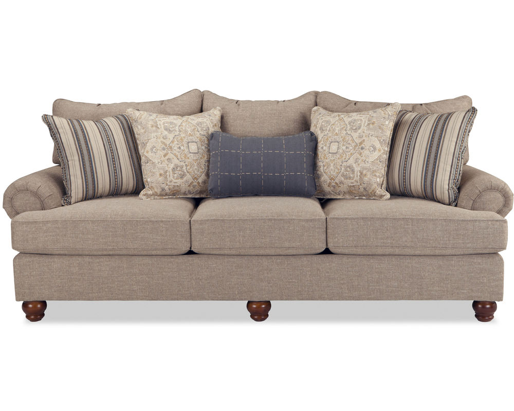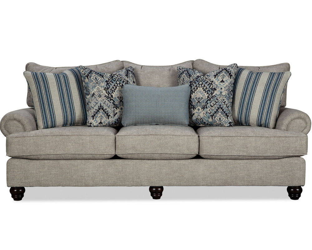This Arlington 7970 Sofa is the perfect addition to any living room or family room. It's a great size, measuring 100" in length, and it has enough room for everyone. It features 3 seats, 3 loose pillow backs, and 5 accent pillows, plus turned legs and a set-back paneled roll arm for a stylish look. But it's the comfort that will really win you over. Its deep and plush cushions and backs give you the perfect place to relax and unwind after a long day. If you're looking for more seating, you can also get the matching loveseat, chair, and ottoman, as well as an 88" length sofa (style 7972) and matching sectional. Plus, there are over 100 high-performance fabrics available, so you can find the perfect look for your home.