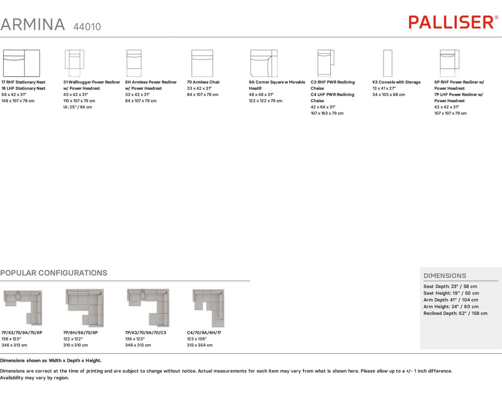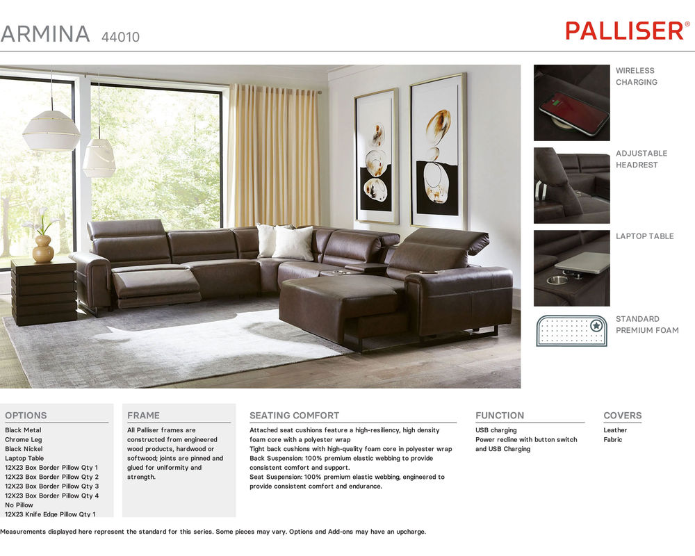 The Armina 44010 Reclining Sectional is not only comfortable but also stylish. It comes with sleek sled legs available in either chrome or black metal, adding a touch of sophistication to your living space. With 13 different pieces to choose from, you can mix and match to find the perfect sectional, and it's on sale now! Don't miss out on this opportunity to enhance your living space with the Armina Reclining Sectional. Call us at 877-702-0555 or visit our website to make your purchase today.