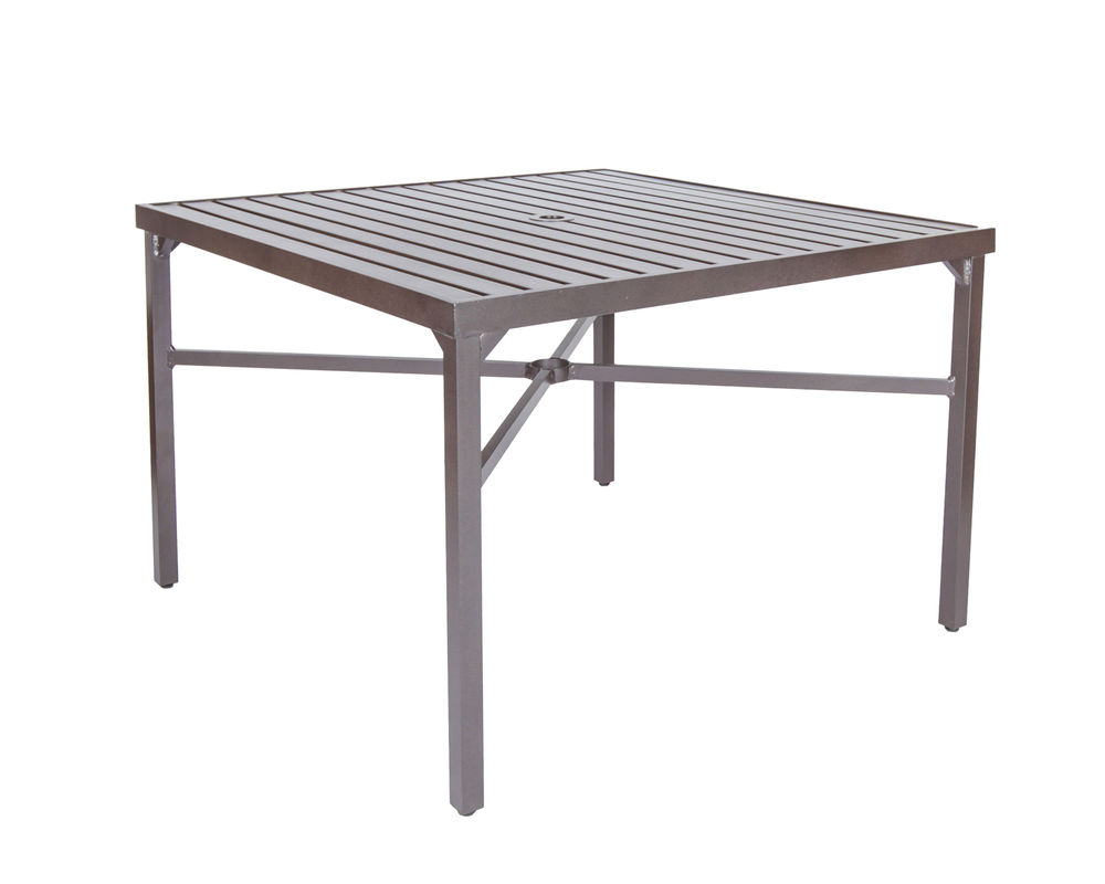 Aluminum slat top and leg stretchers. Fully-welded and assembled. Seats 4. 2” Umbrella hole.