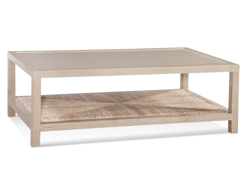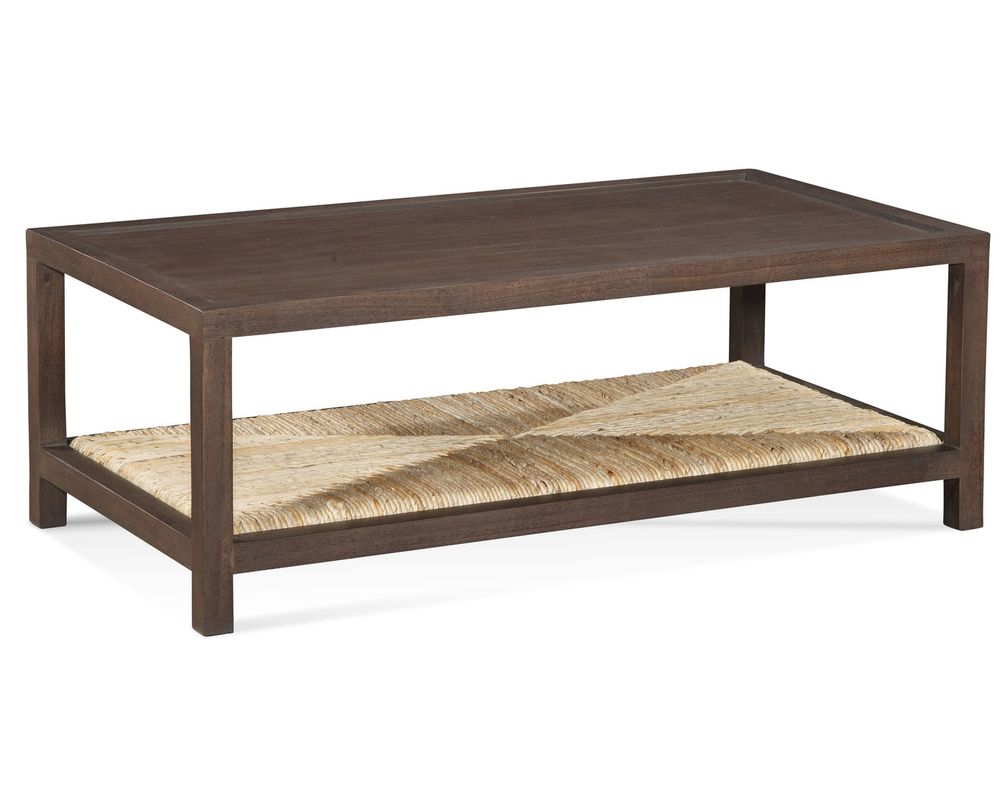 Cocktail Table – A rectangular centerpiece with a smooth top and woven lower shelf, perfect for entertaining or everyday use.
