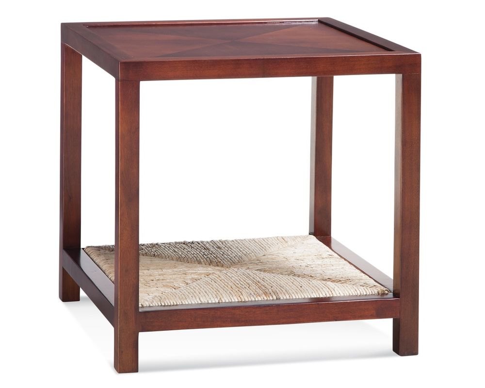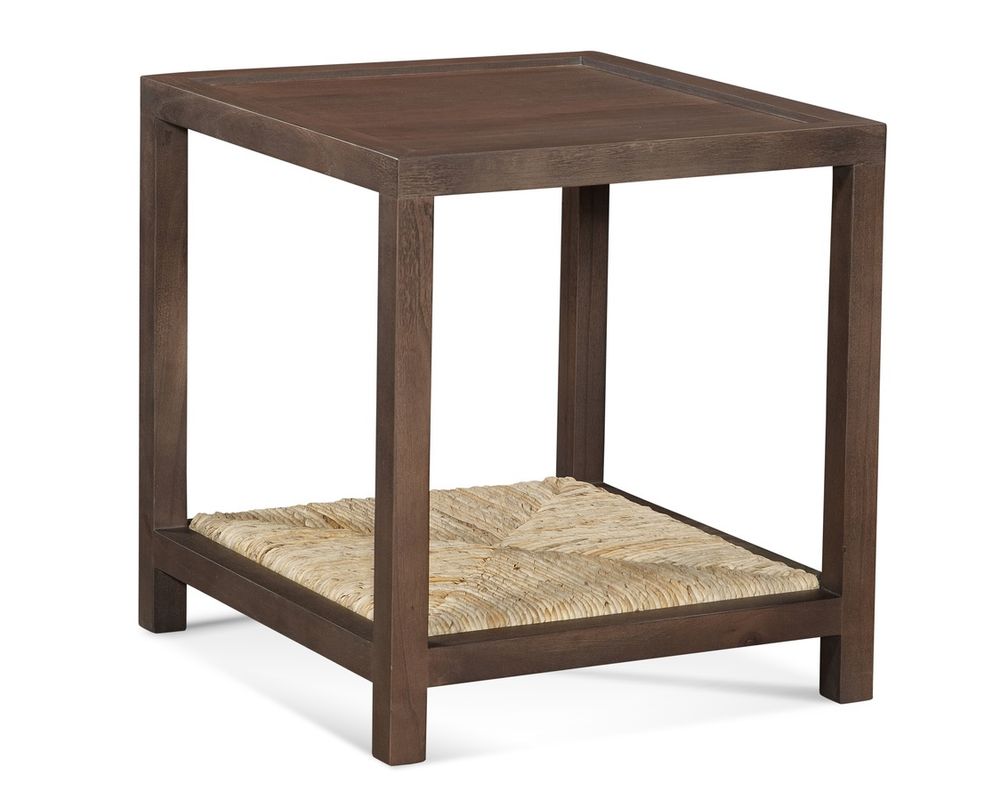End Table – A square accent table with a solid top and woven lower shelf, ideal for lamps, décor, or daily essentials.