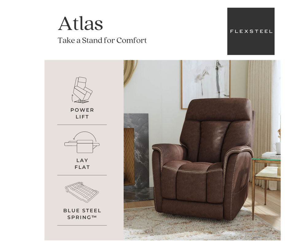 Relieve pressure on your joints and experience seamless movement with the Atlas Power Lift Recliner with Power Headrest and Lumbar. Atlas literally rises to the occasion with a power lift mechanism you can access with a convenient hand wand. When you activate the lift, it effortlessly moves you from a seated to standing position. When you're ready to relax, that same hand control independently adjusts the headrest, footrest and lumbar, so you can recline, enjoy lower back support and keep an eye on your favorite shows. Need to charge devices? A handy USB charging port in the wand makes it easy to keep devices powered up and ready for streaming. A wide, contoured sculpted seat, pad-over sloped arms and buried welt detail with heavy-thread cross-stitching add comfort and style. With a 350-pound weight capacity, Atlas accommodates a wide range of body types while offering all the ergonomic benefits of a power recliner. It's comfortably built to last thanks to our patented Flexsteel DualFlex Spring System™, which offers firmness and flexibility as you sit.