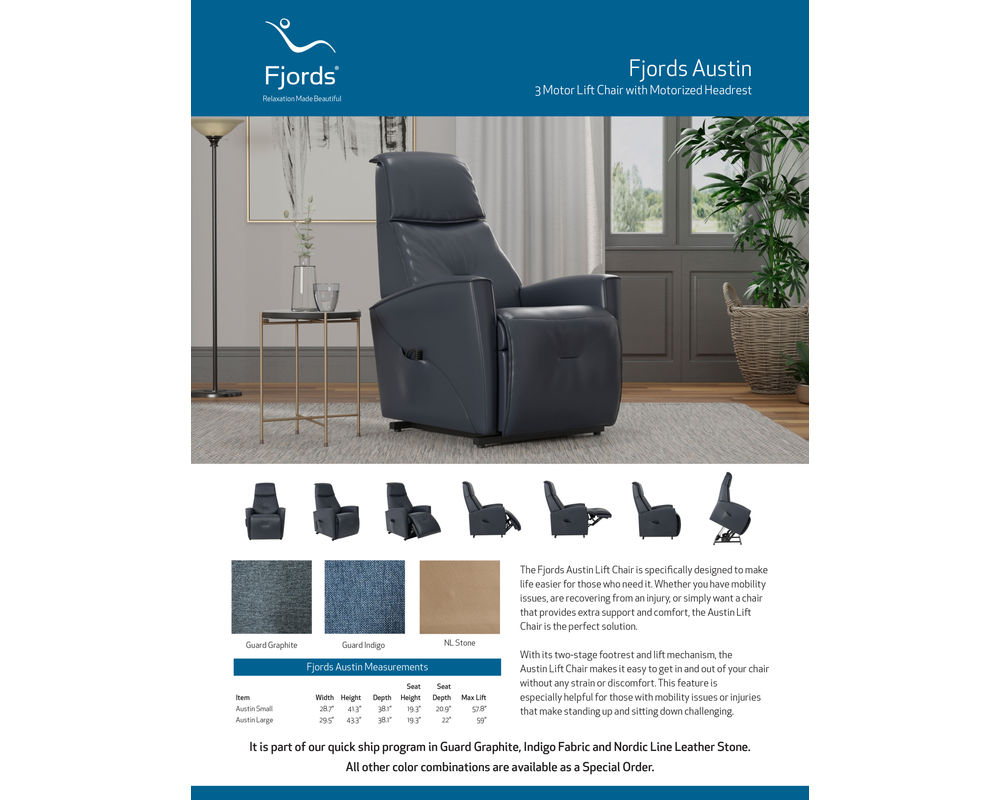 The Fjords Austin Lift Chair is thoughtfully designed to deliver exceptional support, comfort, and confidence for everyday living. Ideal for individuals with mobility challenges, those recovering from injury, or anyone seeking added assistance, the Austin provides a seamless blend of function and refined Scandinavian design—making daily transitions easier and more comfortable.