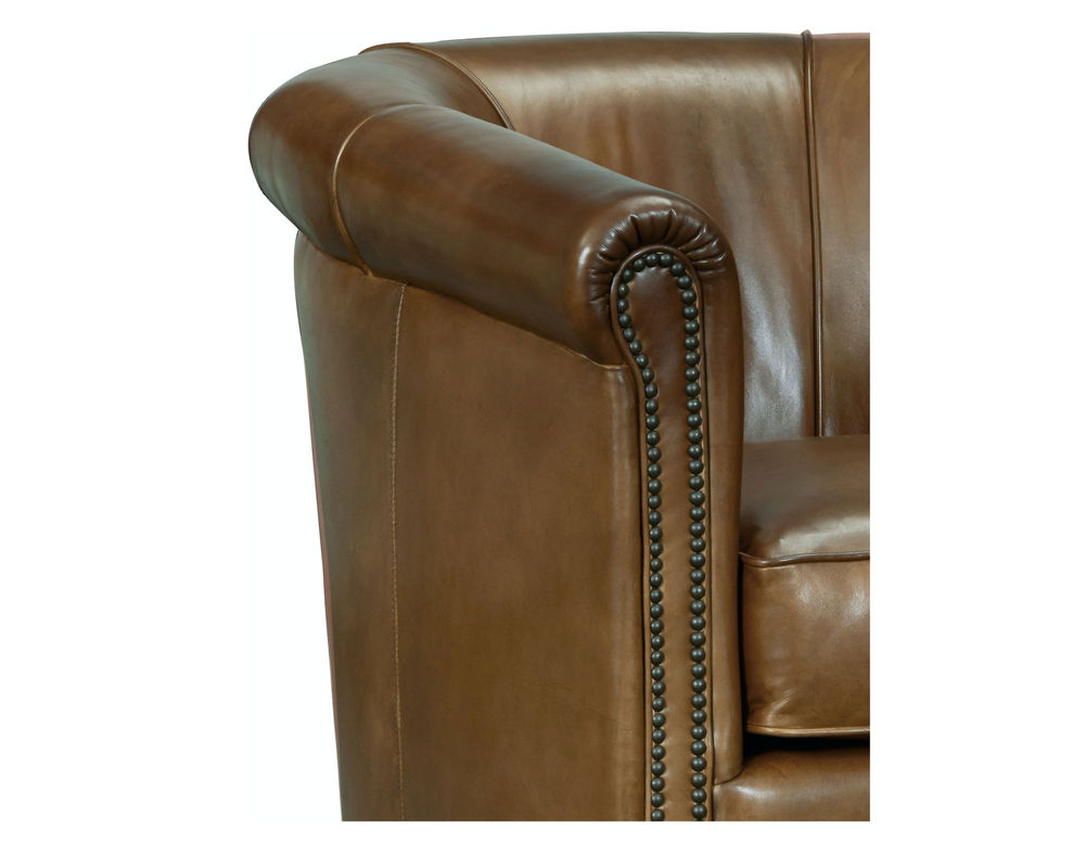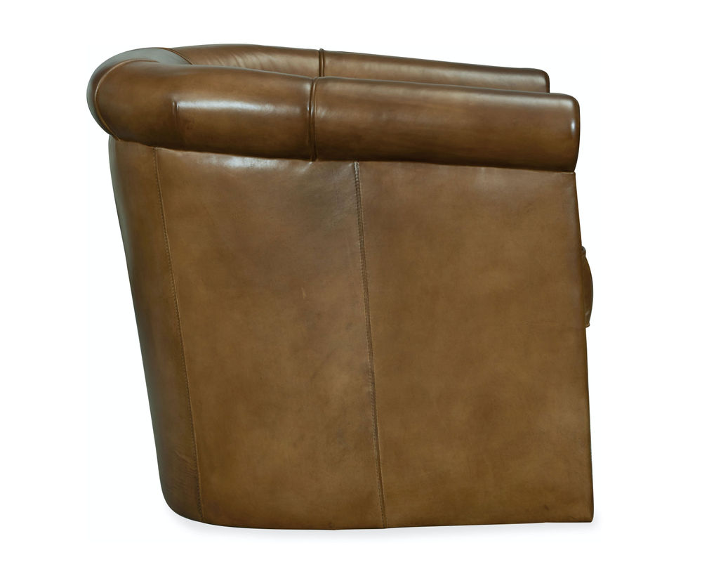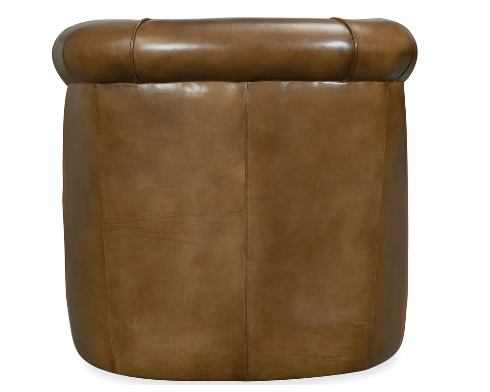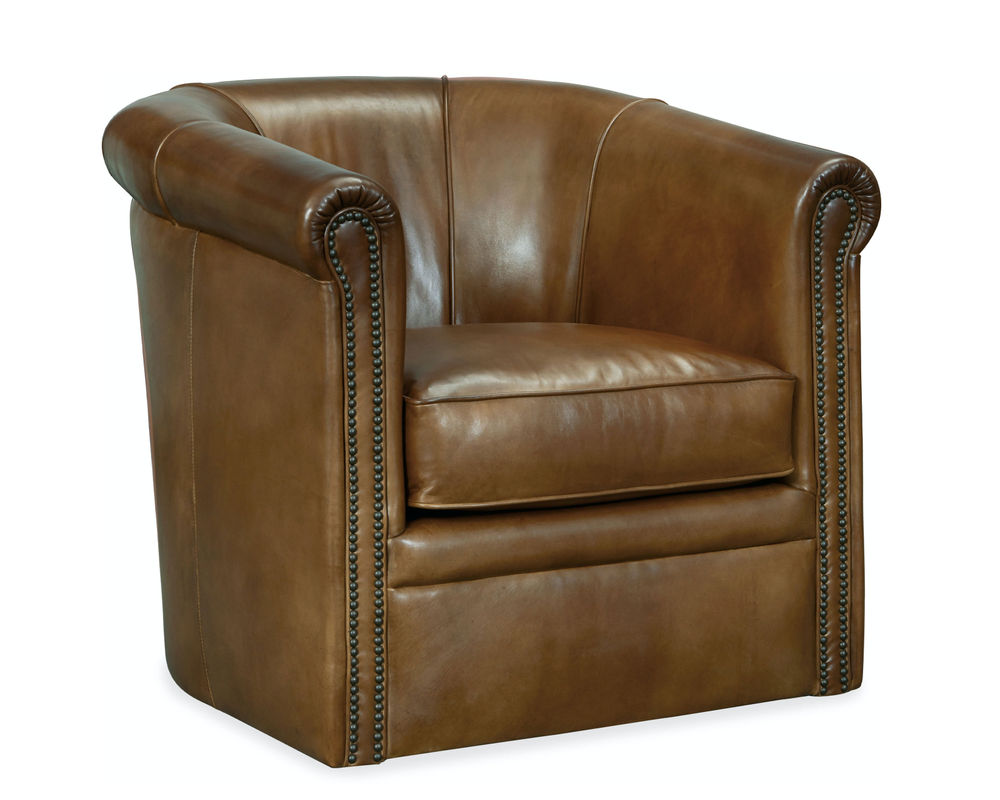 Timeless and traditional, the Axton Swivel Leather Club Chair has a barrel-style silhouette with rolled arms and vertical channeling. Upholstered in the aniline top grain Checkmate Pawn handwiped leather, it is trimmed in antique brass nailheads.