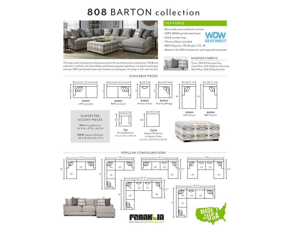 With its modern lines and minimalist design, the Barton 808 Sofa (87") is a great way to add more comfortable seating and style to your transitional or contemporary home. It features two wide T-style cushions that are extra spacious to make sure everyone on the sofa has plenty of personal space. The seat cushions are made in the Comfort Grid Seat Cushion style that enhances not only the durability of the cushions but also improves upon their ride as well. Both the seat and back cushions are reversible in order to allow you to flip them to keep the sofa looking its cleanest. On either side of the cushions are two wide, flat arms that sit low on the sofa to enhance its modern appeal. The sofa measures a large and accommodating 87 inches in width by 43 inches in depth by 35 inches in height.