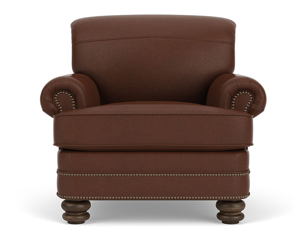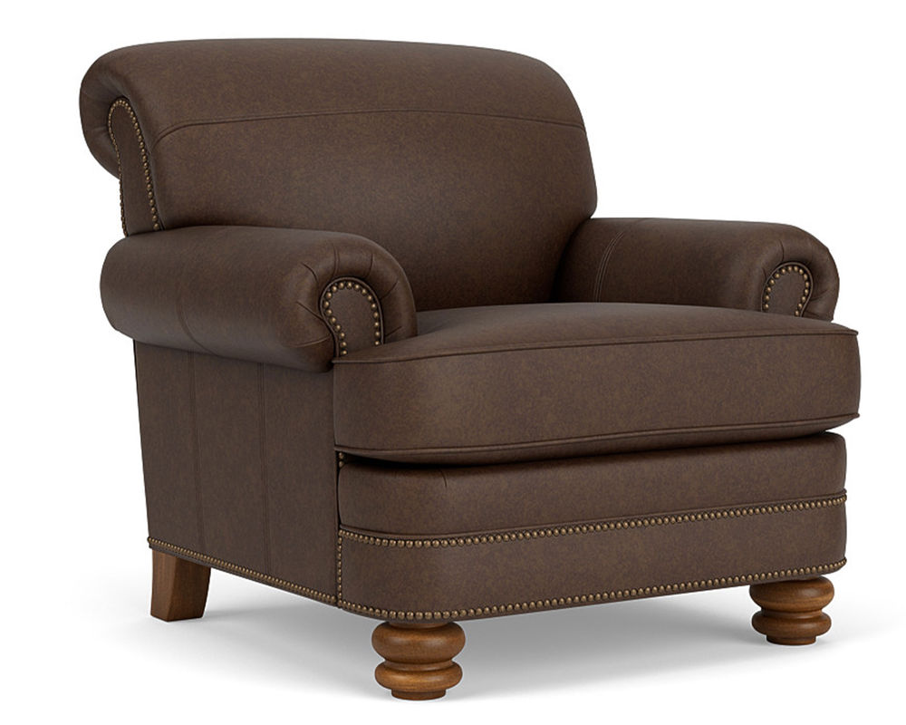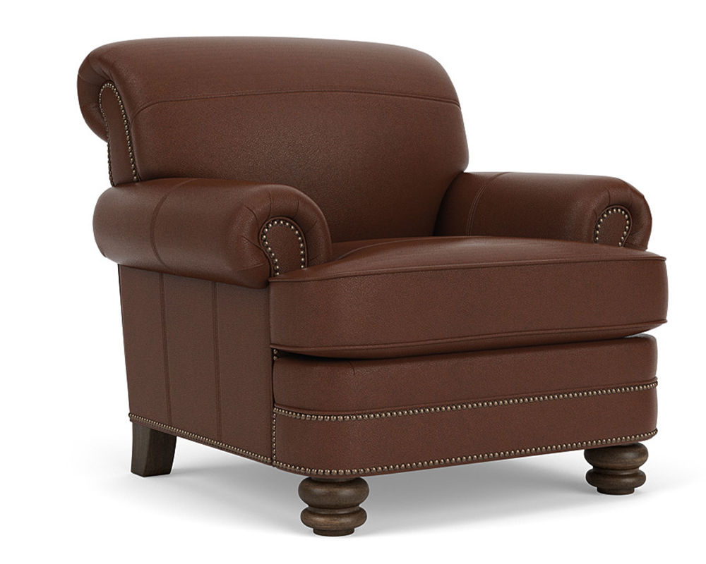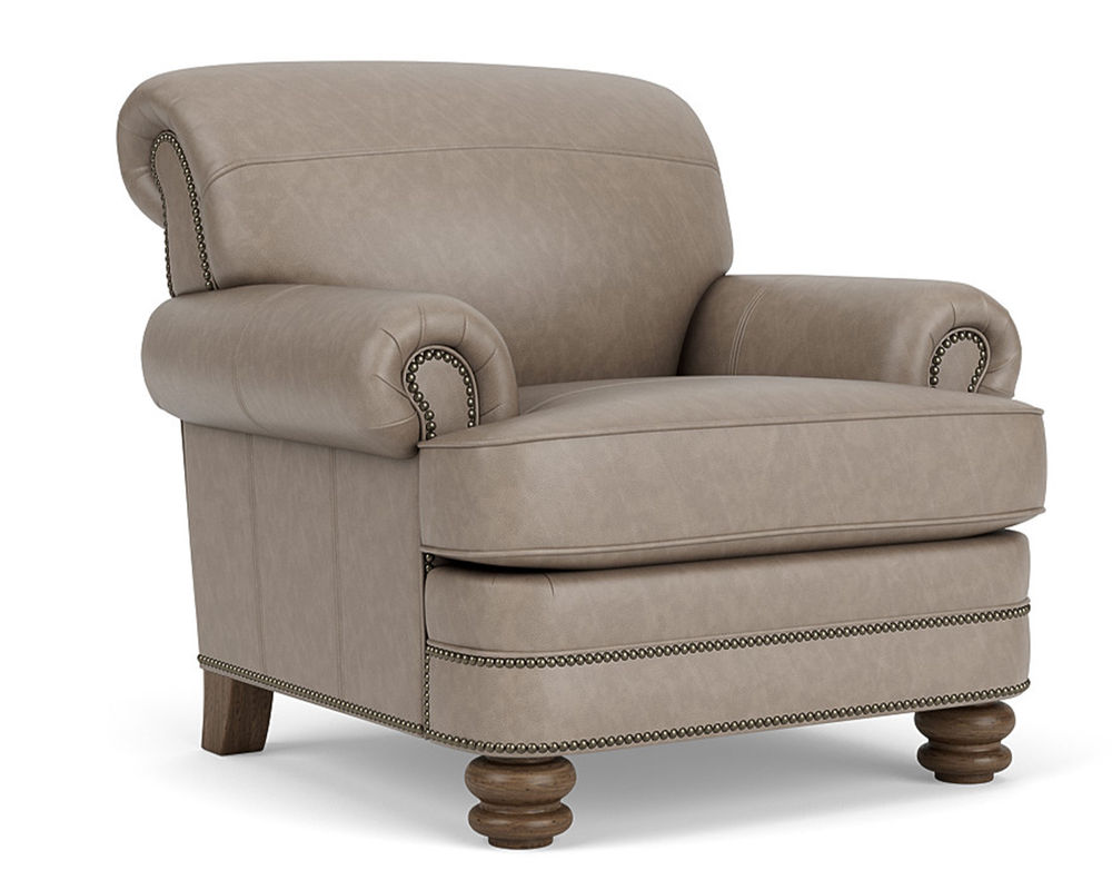 The Flexsteel Bay Bridge 3790 Nailhead Leather Chair is the perfect combination of style and comfort. This classic piece of furniture features timeless details such as rolled arms, a rounded front rail, welt cord-lined back and side panels, and round bun feet. Plus, it is available in over 50 top-grain leathers, so you can customize it to your exact specifications. If you're looking for a traditional piece of furniture with a hint of modern flair, the Flexsteel Bay Bridge 3790 Nailhead Leather Chair is the perfect choice. The chair also features nailhead trim to add a touch of sophistication. With free shipping included, you can bring a piece of history into your home. Make a statement with the Flexsteel Bay Bridge 3790 Nailhead Leather Chair.