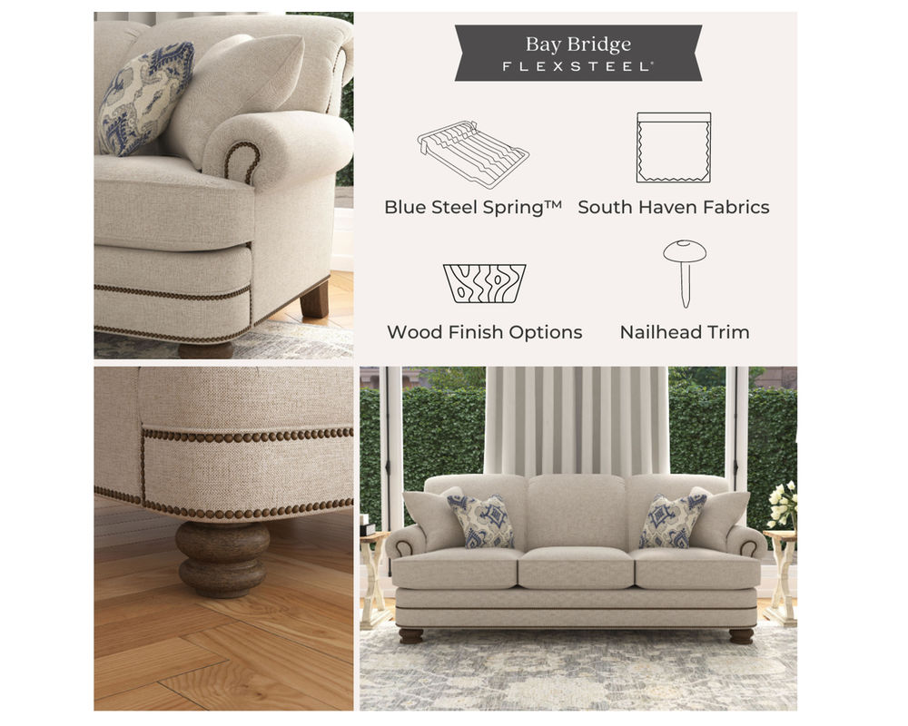 Bring a bit of history into your home with the Flexsteel Bay Bridge 3790 Leather Sofa. It's available with optional nailhead trim for an even more classic look. Enjoy the luxury of a leather sofa that will last for years to come. With its classic design and superior quality, you won't be disappointed!