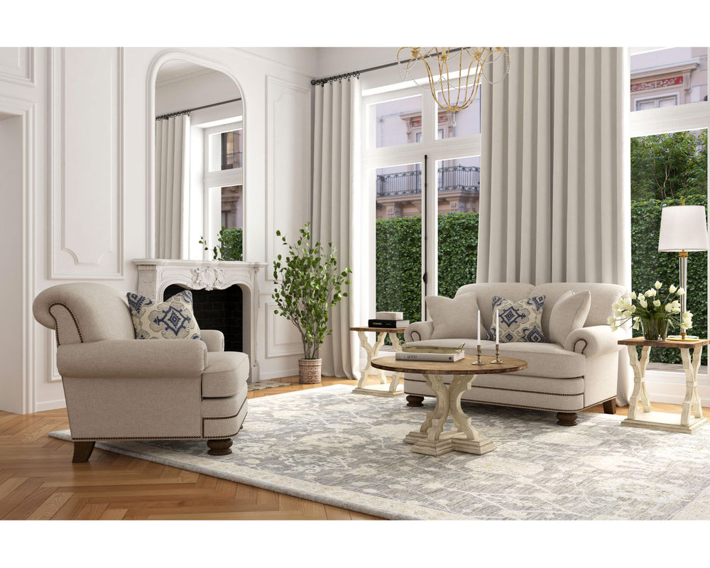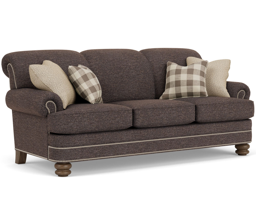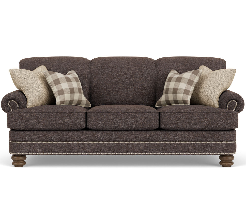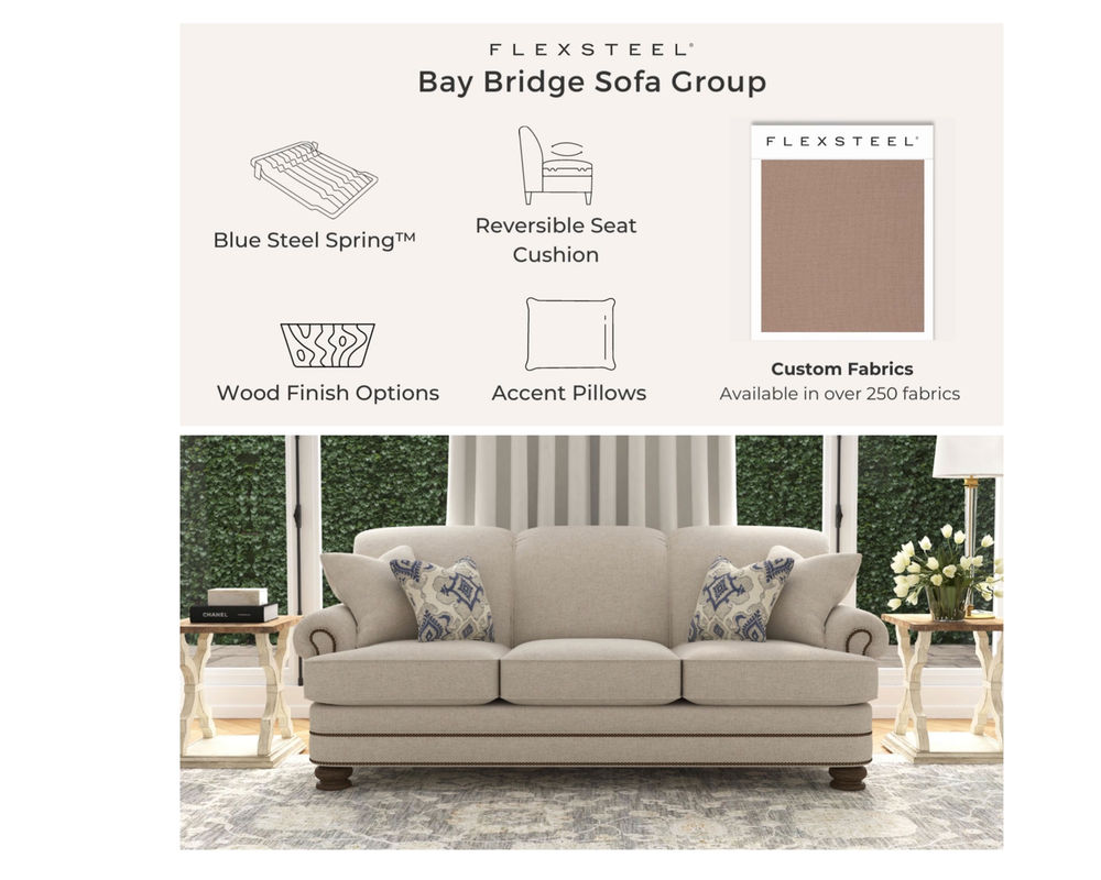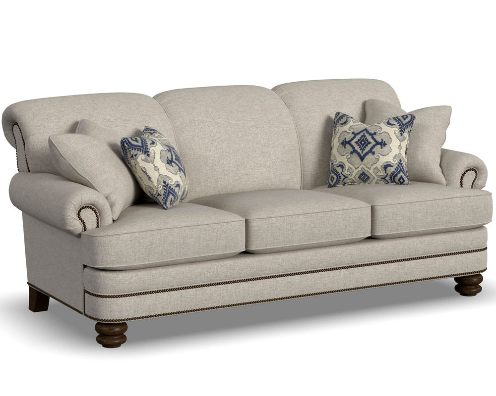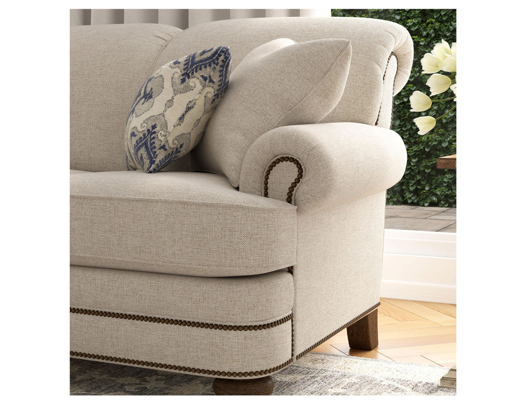 The Flexsteel Bay Bridge 7791 Nailhead Sofa brings classic charm to any living space. With its soft styling and classic details, this sofa looks like it's been passed down through generations. It features tightly rolled arms, a rounded front rail, back and side panels lined with welt cord, and round bun feet - creating a timeless style that never goes out of fashion. It's easy to customize this piece with your choice of over 100 high-performance and standard fabric options, plus nailhead trim. And, for even more convenience, free shipping is included with your purchase. Relax in the luxury of this timeless piece and create a living space that will be cherished for years to come.