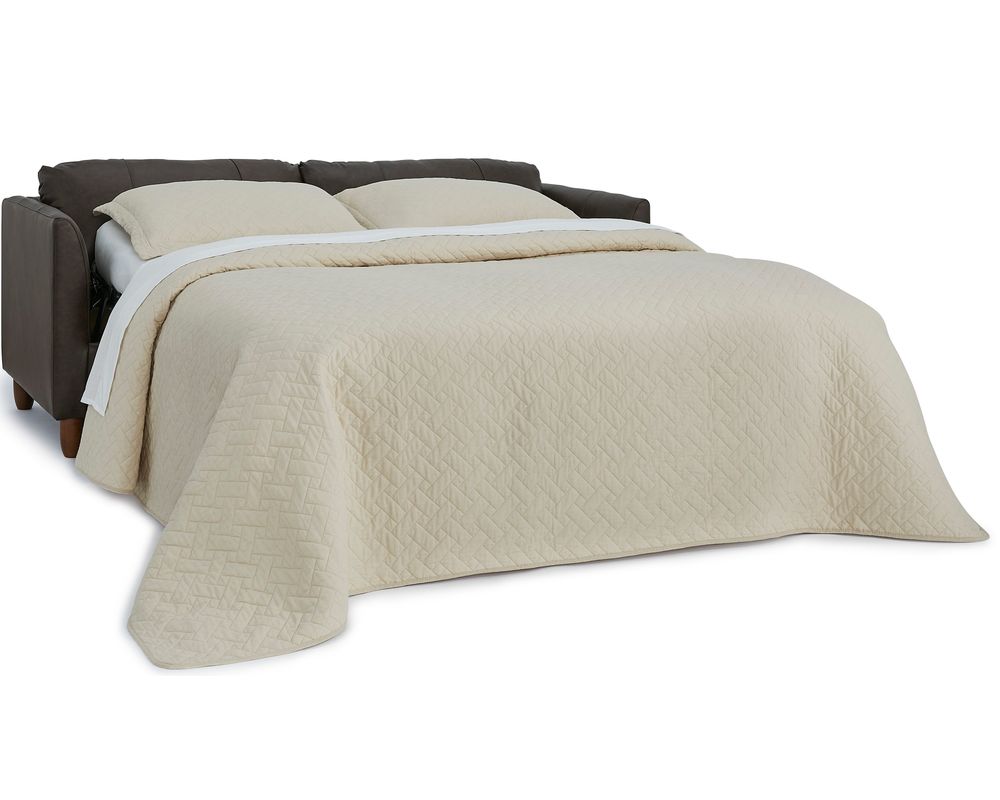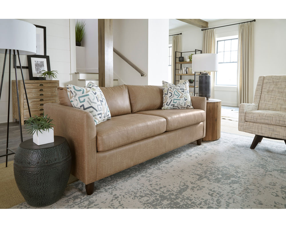 Loose back cushions are filled with plush pillow fibers and feature zipper access for easy adjustments, ensuring long-lasting comfort and a refreshed look for years to come. Each sleeper includes toss pillows and can be personalized from over 40 top-grain leathers and more than 100 fabrics. Finished with sleek turned wooden legs available in Dark Walnut, Honey Birch, or Espresso, the Bayment Sleeper combines versatility, comfort, and sophistication.