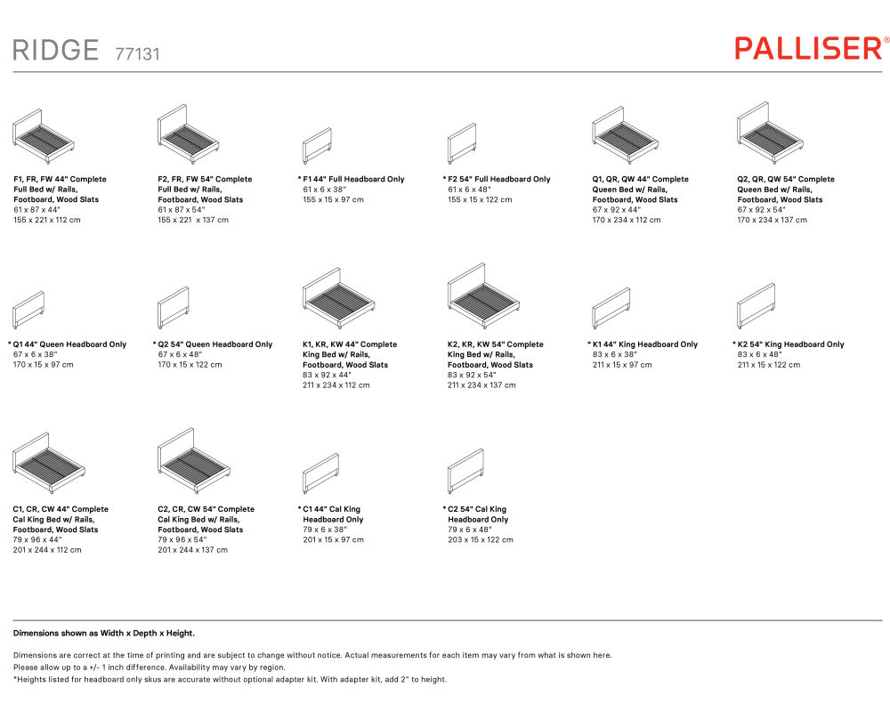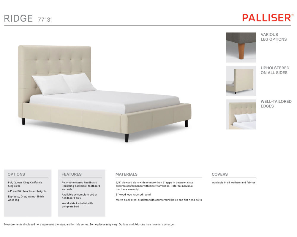 The complete bed set includes a headboard, footboard, rails, and sturdy wood slats, providing everything you need for a comfortable and stylish sleeping experience. The Ridge bed is also available in a California king-size.