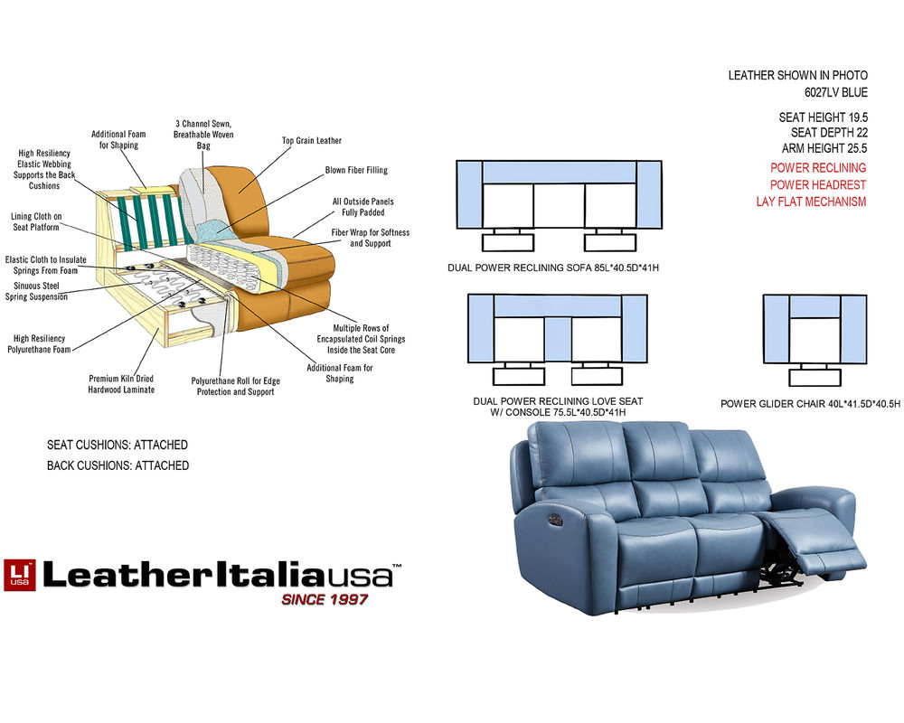 Features Include •. Pocket Seating Coils – Luxury Like a Pillow Top Mattress •. Leather Italia USA – Handcrafted Leather Furniture • Quality Built from the Inside Out •Structurally very strong frame using primarily hardwood and laminate •Corner blocked in all load bearing areas •The frames are padded so no wood ever touches the leather covering • Power Recline and Power Headrest Included •. Leather Everywhere Your Body Touches