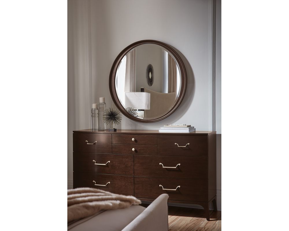 The Bella Donna Round Mirror is finished in a rich dark wood color, adding a touch of warmth and luxury to its design. The caviar finish, with its deep translucent tone on rich cathedral cherry veneers, adds a touch of glamour and sophistication to this already stunning mirror. This makes it the perfect addition to any modern, traditional, or even rustic-themed space.