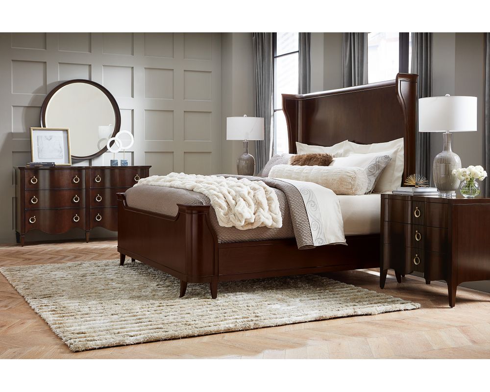 Hooker Furniture's Bella Donna collection is characterized by its elegant forms, rich with shape and movement. Channeling Sophia Loren's timeless sophistication and style as its muse, Bella Donna appeals to the classic consumer but with a little "edge" to their design style. Caviar, the primary finish for Bella Donna, has a deep translucent tone on rich cathedral cherry veneers. Akoya, representing the purest white pearls in the world, is a perfect accent finish, adding sophistication and a bit of glam. Unique design details include reeding on selected pieces that create a "curtain effect," reverse breakfront serpentine silhouettes, glass tops, and exposed metal legs. Adding the finishing touch, this home collection features custom-designed hardware in a champagne finish, including traditional and modern forms.