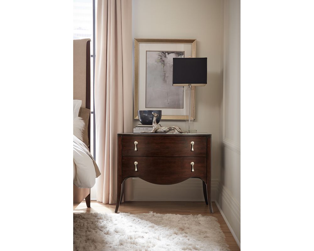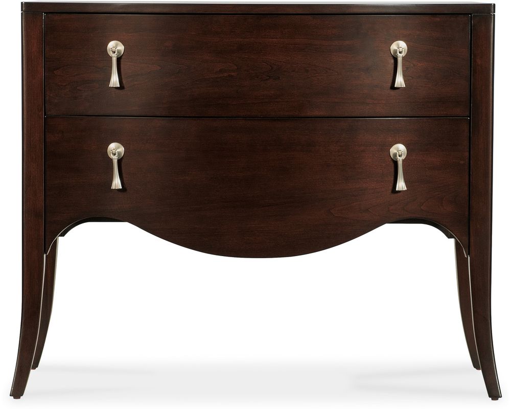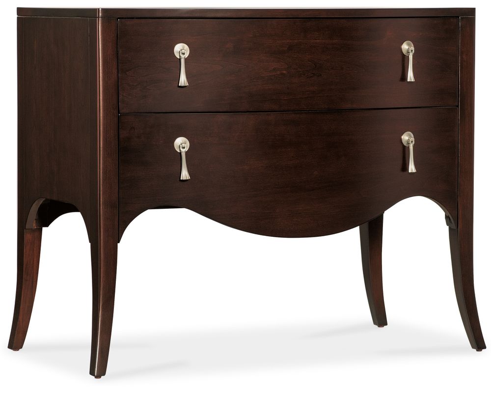 Hooker Furniture's Bella Donna collection is characterized by its elegant forms, rich with shape and movement. Channeling Sophia Loren's timeless sophistication and style as its muse, Bella Donna appeals to the classic consumer but with a little "edge" to their design style. Caviar, the primary finish for Bella Donna, has a deep translucent tone on rich cathedral cherry veneers. Akoya, representing the purest white pearls in the world, is a perfect accent finish, adding sophistication and a bit of glam. Unique design details include reeding on selected pieces that create a "curtain effect," reverse breakfront serpentine silhouettes, glass tops, and exposed metal legs. Adding the finishing touch, this home collection features custom-designed hardware in a champagne finish, including traditional and modern forms.