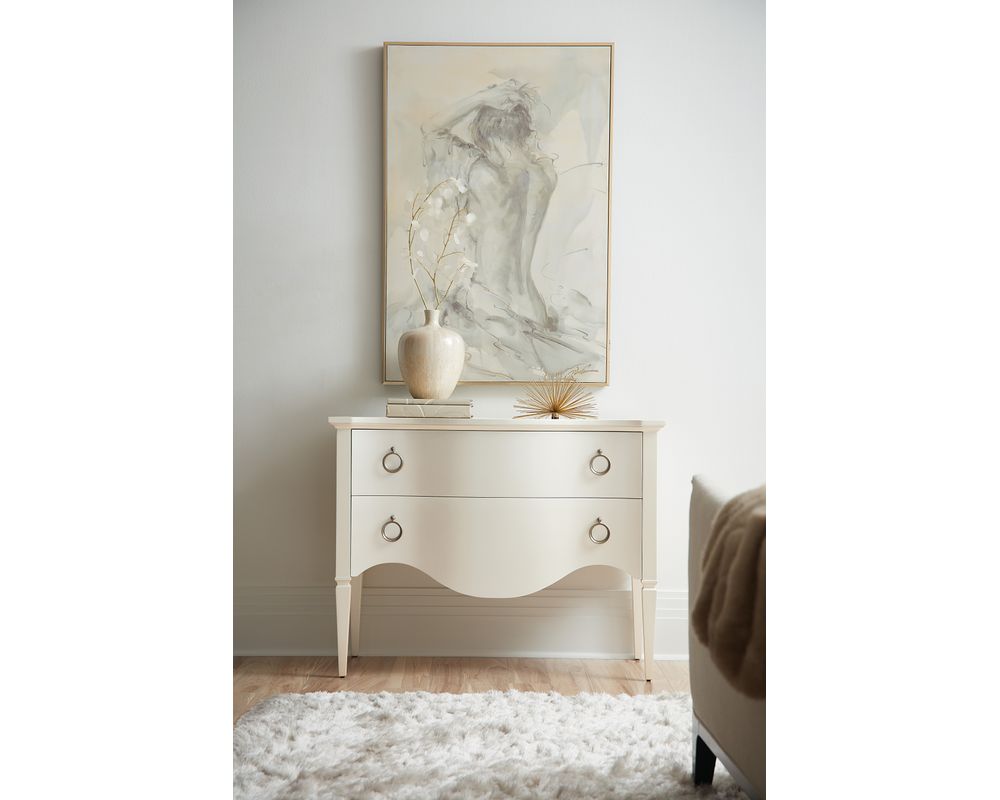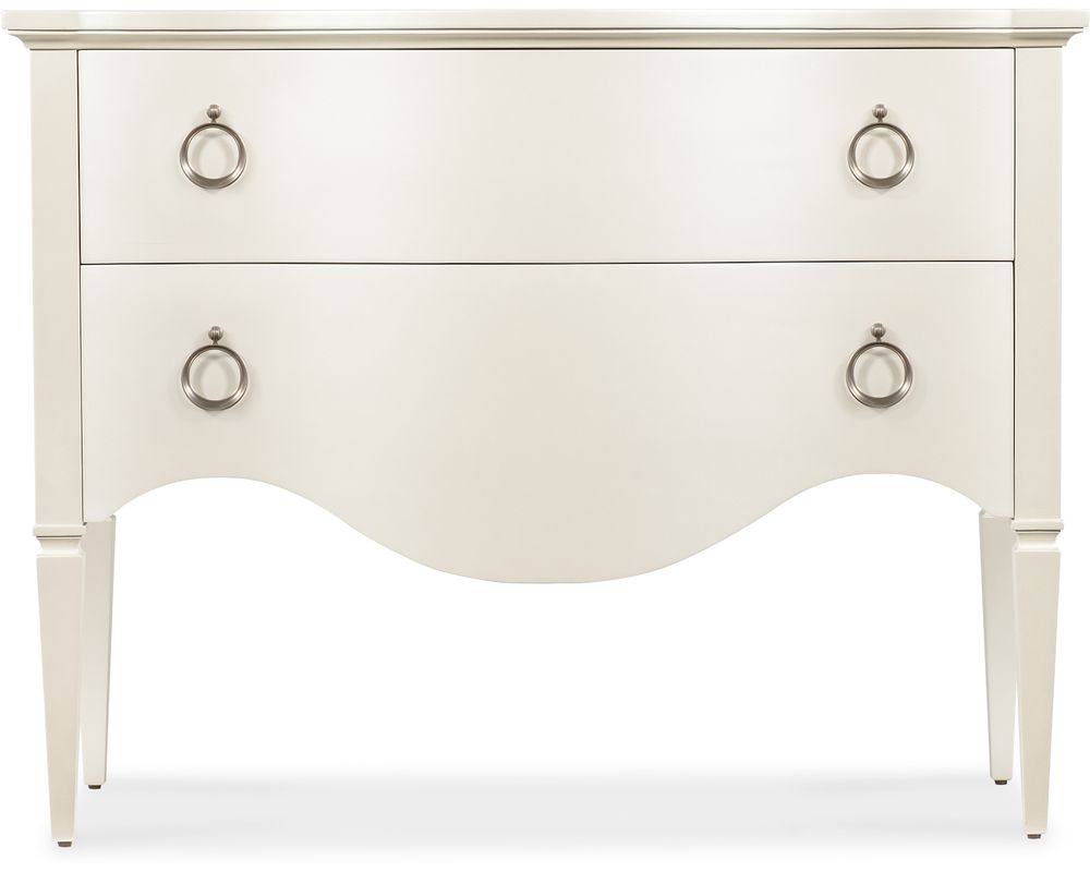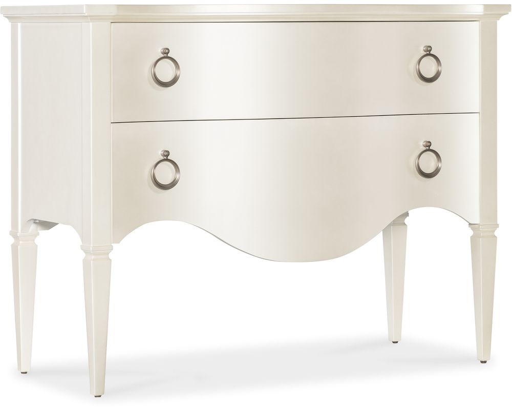 Hooker Furniture's Bella Donna collection is characterized by its elegant forms, rich with shape and movement. Channeling Sophia Loren's timeless sophistication and style as its muse, Bella Donna appeals to the classic consumer but with a little "edge" to their design style. Caviar, the primary finish for Bella Donna, has a deep translucent tone on rich cathedral cherry veneers. Akoya, representing the purest white pearls in the world, is a perfect accent finish, adding sophistication and a bit of glam. Unique design details include reeding on selected pieces that create a "curtain effect," reverse breakfront serpentine silhouettes, glass tops, and exposed metal legs. Adding the finishing touch, this home collection features custom-designed hardware in a champagne finish, including traditional and modern forms.