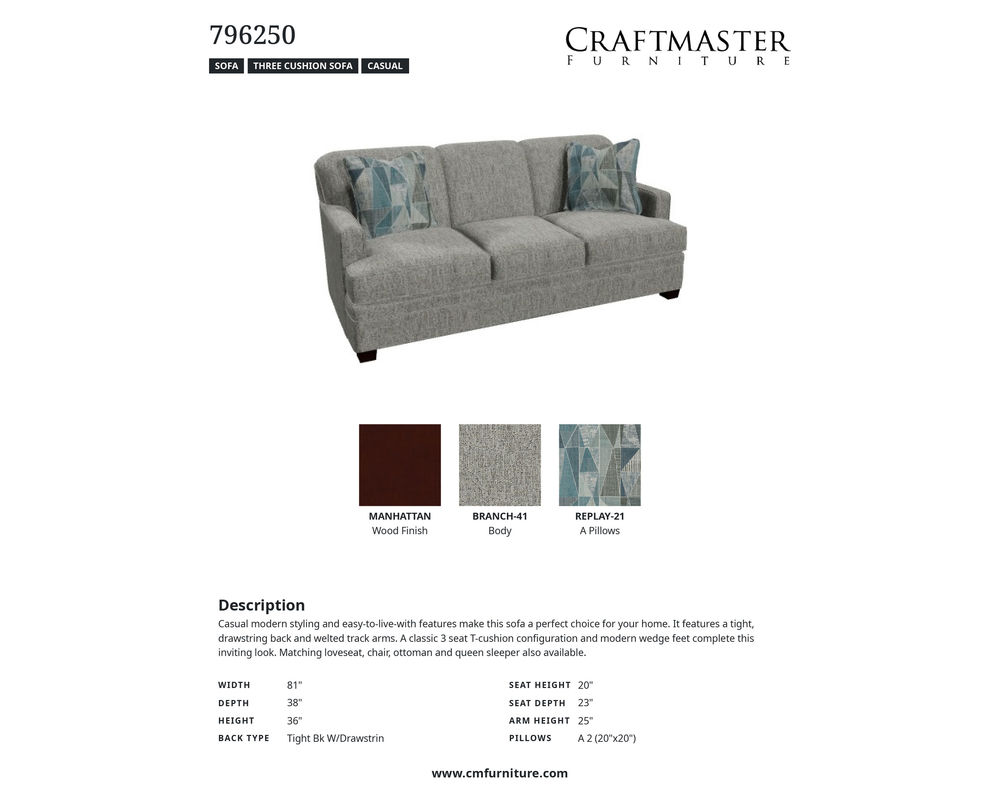 NOTE: Due to dye lot variations from fabric suppliers, Craftmaster Furniture cannot guarantee dye lot matches unless products are purchased simultaneously.