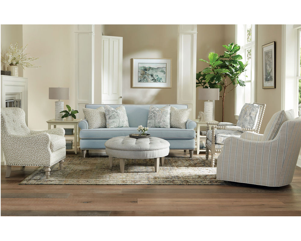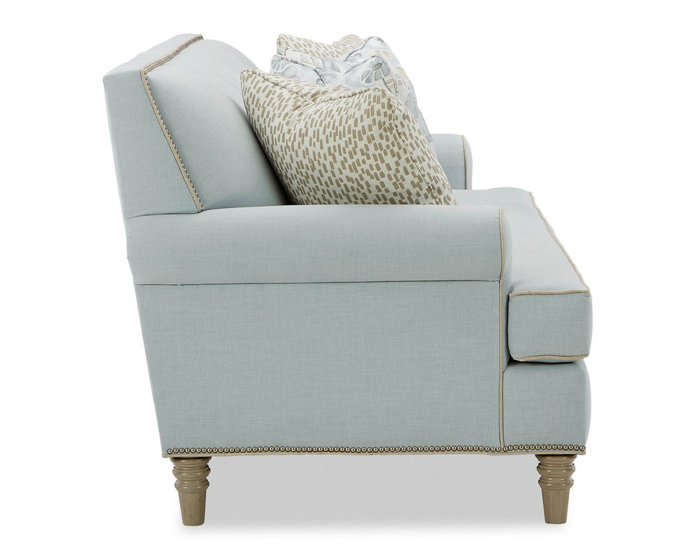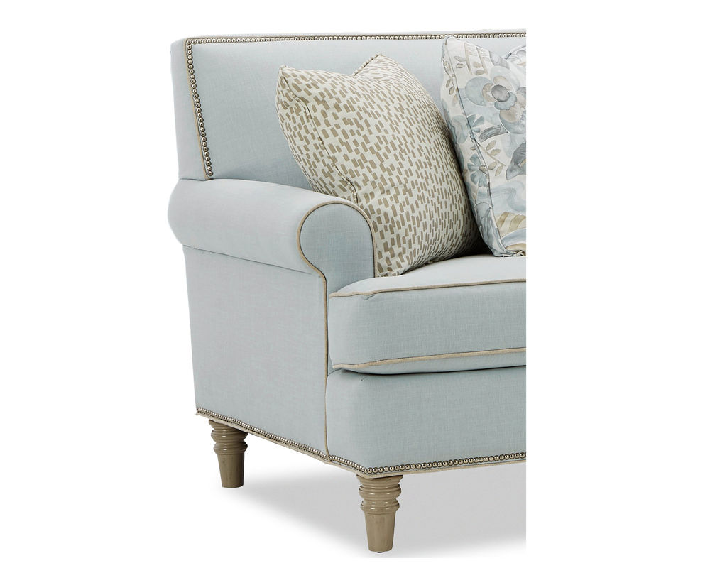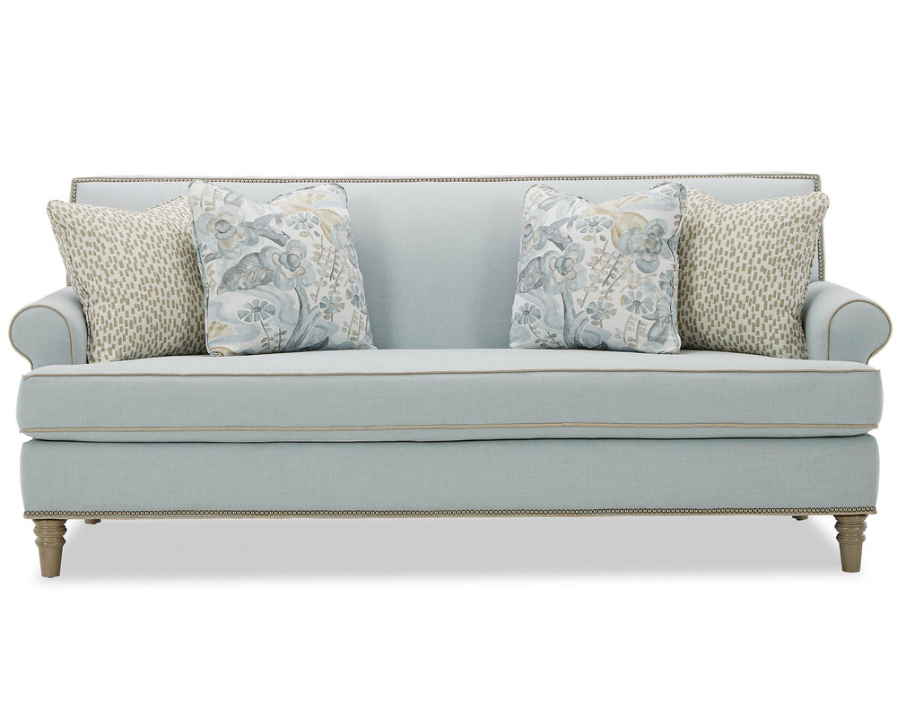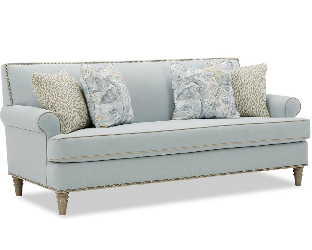 You've heard of a showstopper? The show will definitely stop when your guests get their first look at this stunning sofa from the Paula Deen Home collection! The clean, transitional styling of this sofa is accented with gorgeous nail head trim around the back rail and the base. It features sock arms, a tight back, bench seat, and as always, Paula's exclusive premium Down Blend seat cushion for the ultimate in softness. Standard with 2 pairs of pillows. Also available is the matching loveseat, chair, and ottoman. Also available without nail head trim. Over 100 high performance fabrics and 15 wood finishes.