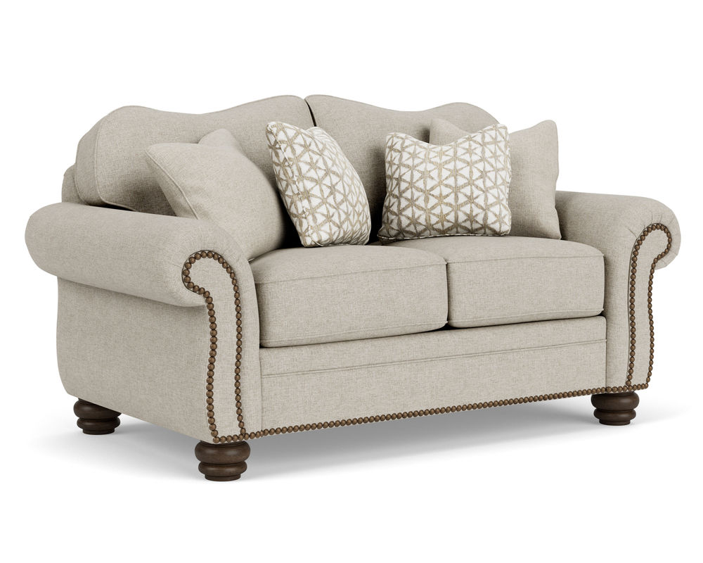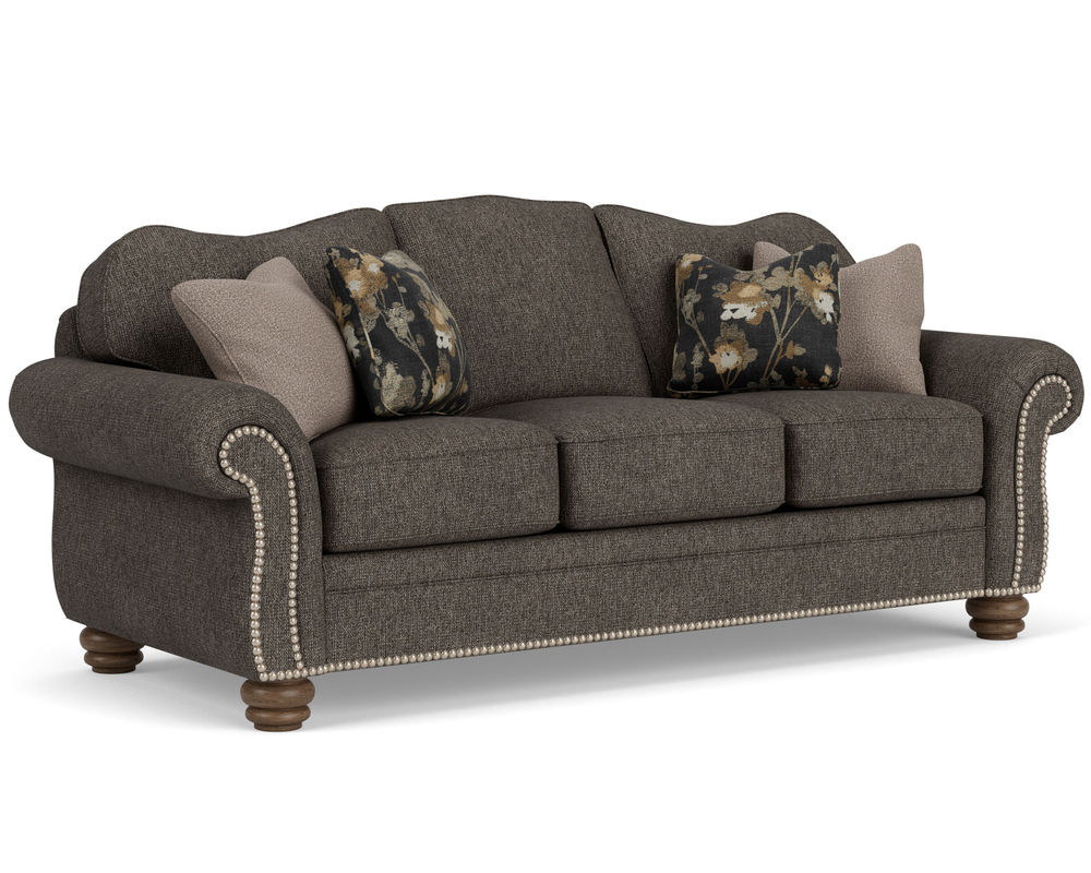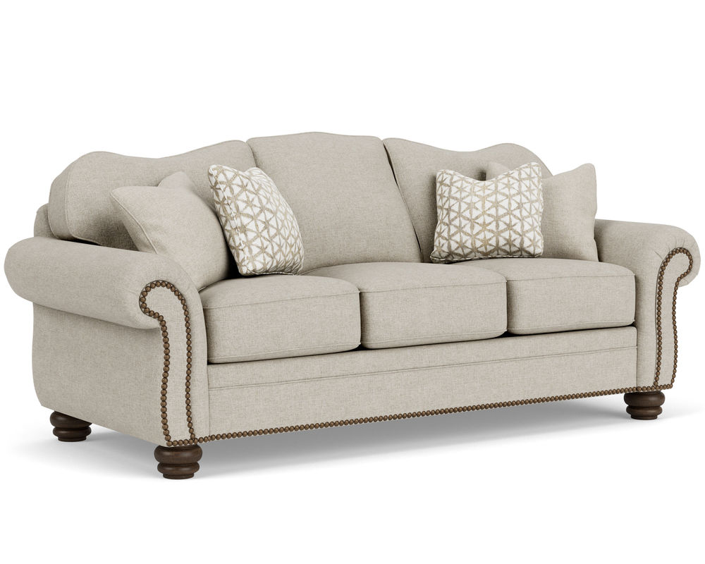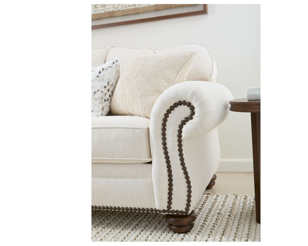 The Flexsteel Bexley 8646 Nailhead Sofa provides timeless comfort with a vintage design. This classic frame offers a gracefully curved back, cozy padded rolled arms, and bun feet. The cushions are plush and the construction is top-of-the-line, ensuring years of comfort. Nailhead trim is included and over 100 performance and standard fabrics can be chosen to suit your taste. With this sofa, you'll be sure to find the perfect style and comfort for your home.