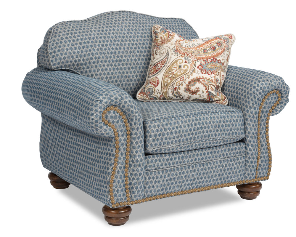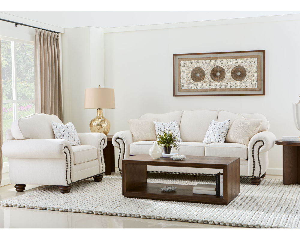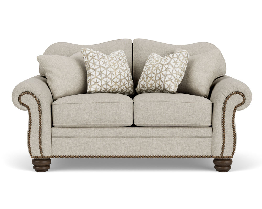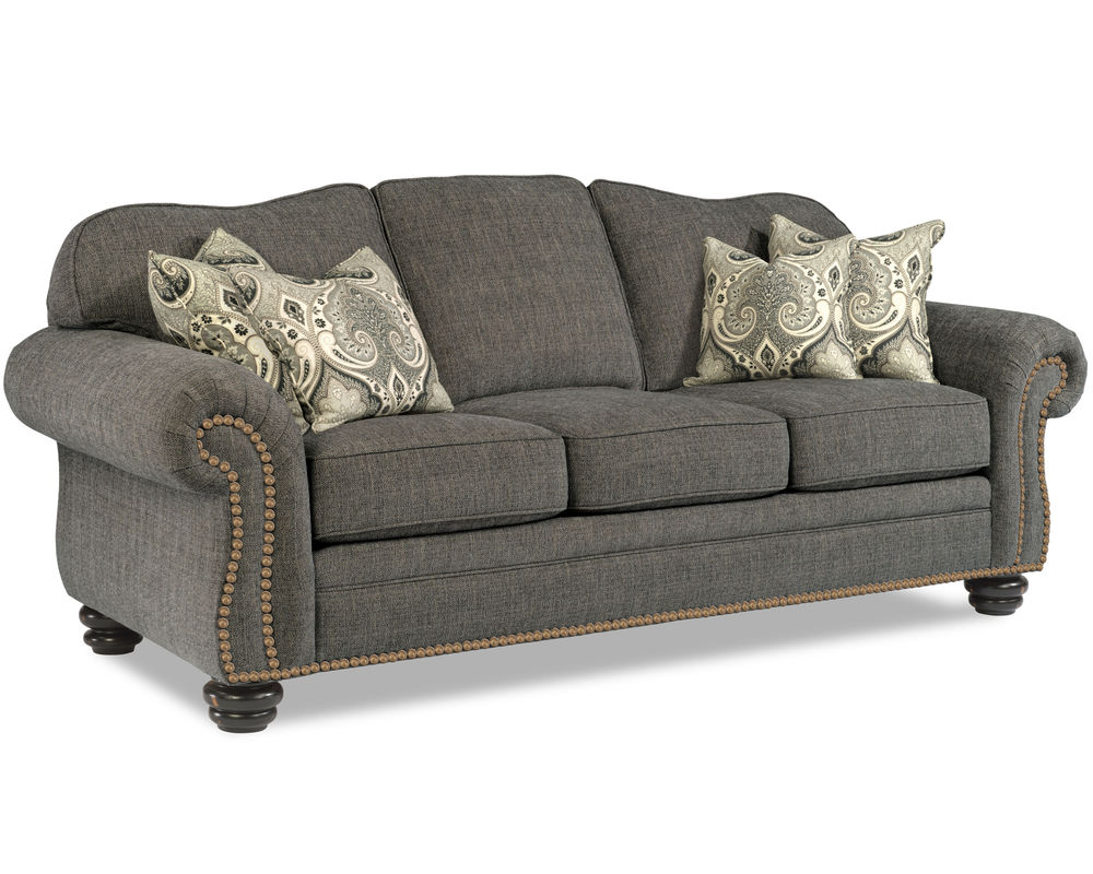 The Flexsteel Bexley 8646 Nailhead Sofa provides timeless comfort with a vintage design. This classic frame offers a gracefully curved back, cozy padded rolled arms, and bun feet. The cushions are plush and the construction is top-of-the-line, ensuring years of comfort. Nailhead trim is included and over 100 performance and standard fabrics can be chosen to suit your taste. With this sofa, you'll be sure to find the perfect style and comfort for your home.