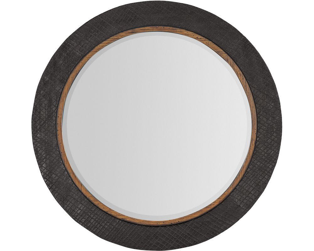 From Sofas and Sectionals.com: The Big Sky 42 "Round Accent Mirror brings a touch of rustic beauty to your home. Inspired by the rugged landscapes of the American wilderness, this mirror exudes a sense of tactile and organic charm. The dramatic crosshatch texture on the border, finished in charcoal-colored Furrowed Bark, adds a rugged and natural element to the overall design.