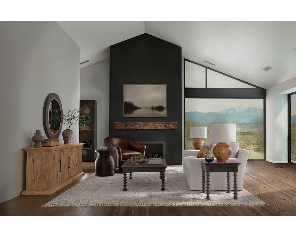 From Sofas and Sectionals.com: The Big Sky Turned Leg Cocktail Table will introduce a touch of rustic charm to your living space. This stunning piece is designed with a vintage aesthetic reminiscent of idyllic scenes from the American countryside. Crafted with meticulous attention to detail, it is made from high-quality Pecky Hickory Veneers and features a solid-wood-edged top. The table is finished in Charred Timber, a unique color inspired by the regenerative nature of a forest after a fire.