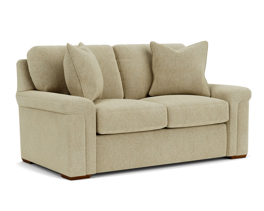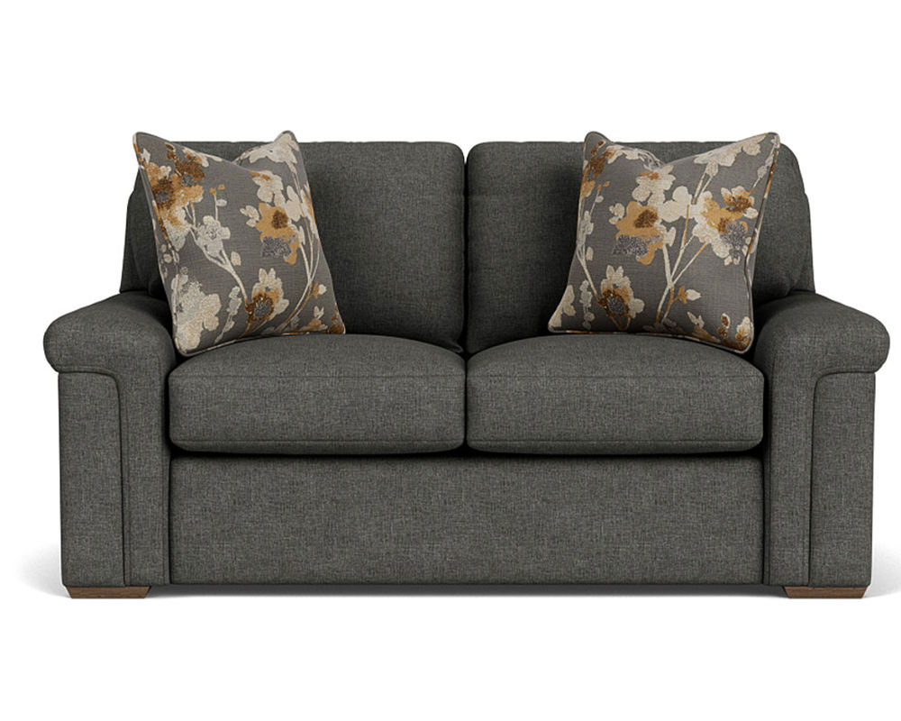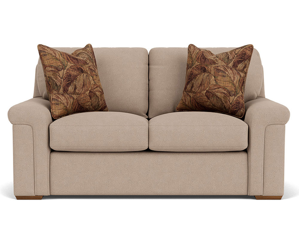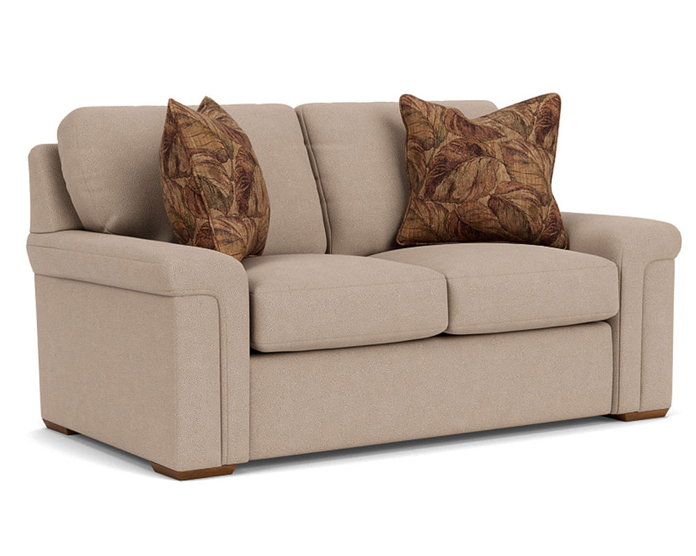 The Flexsteel Blanchard 5649 Loveseat is the perfect combination of form and function. Its transitional design is sure to be a hit and will add a touch of style to any living space. The ample and well-constructed cushions provide the utmost comfort and relaxation, and the reversible seat cushions preserve their shape and extend the life of the fabric. The bold square, tapered block leg adds a modern touch, while two throw pillows add a pop of color. The soft padded track arm with a square, tapered block leg adds to the overall look and feel of the piece. Whether you're looking to relax or entertain, this loveseat is the perfect fit.