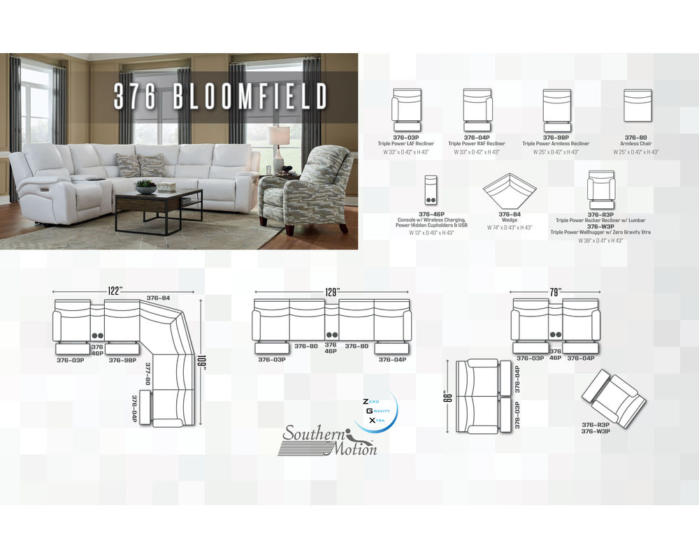The Bloomfield 376 Triple Power Reclining Sectional redefines modular motion seating with a bold yet inviting presence that blends architectural styling with exceptional comfort. Designed to make a statement while adapting effortlessly to your space, Bloomfield delivers a refined balance of strength, softness, and innovation.