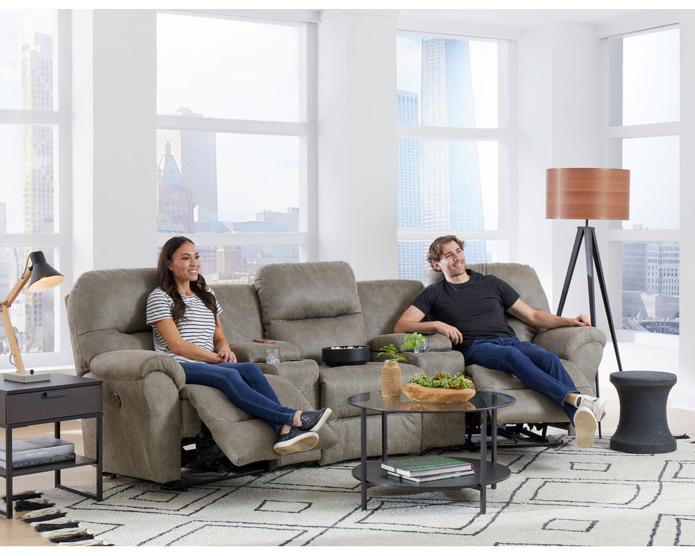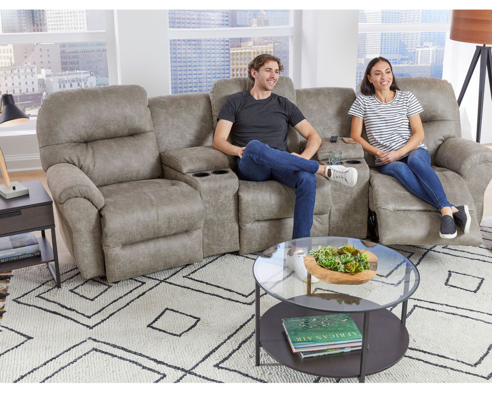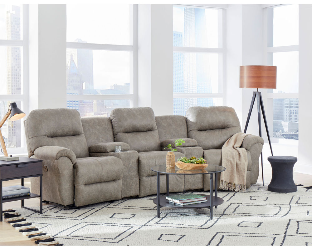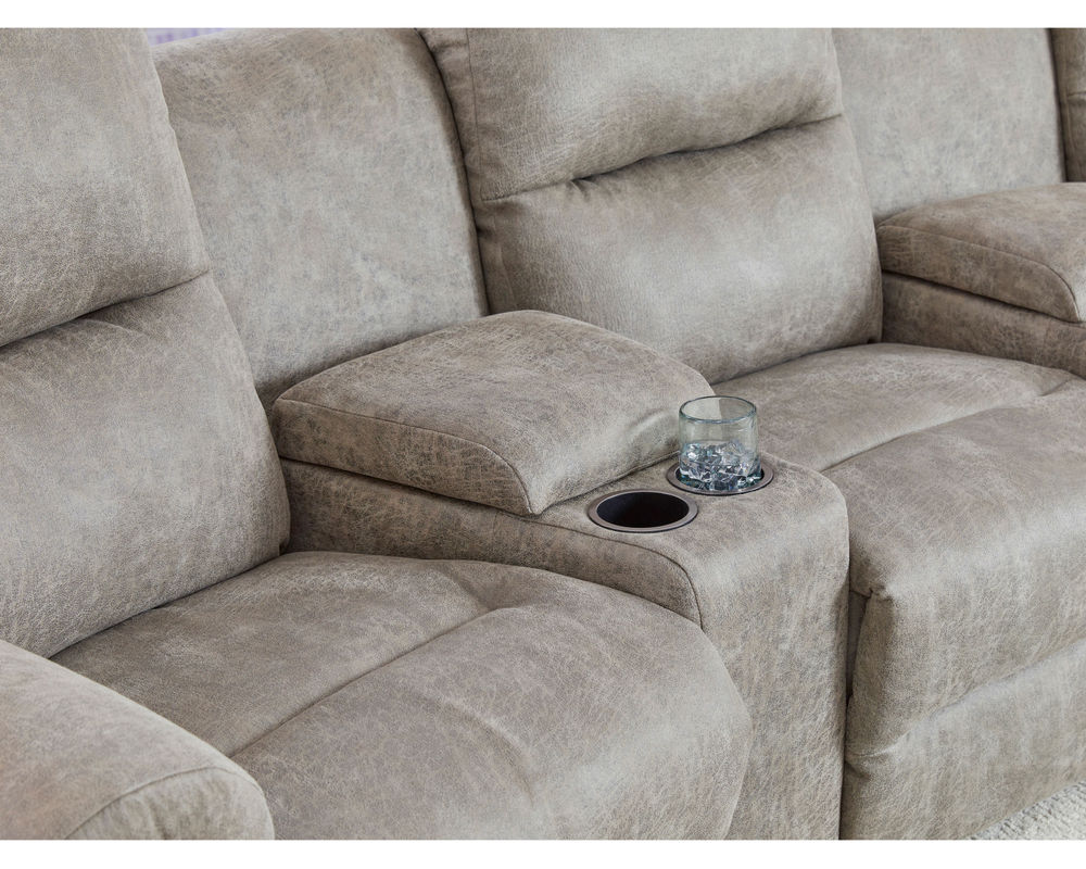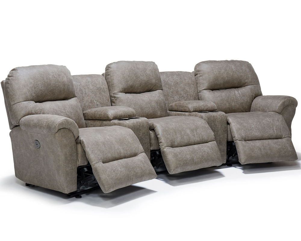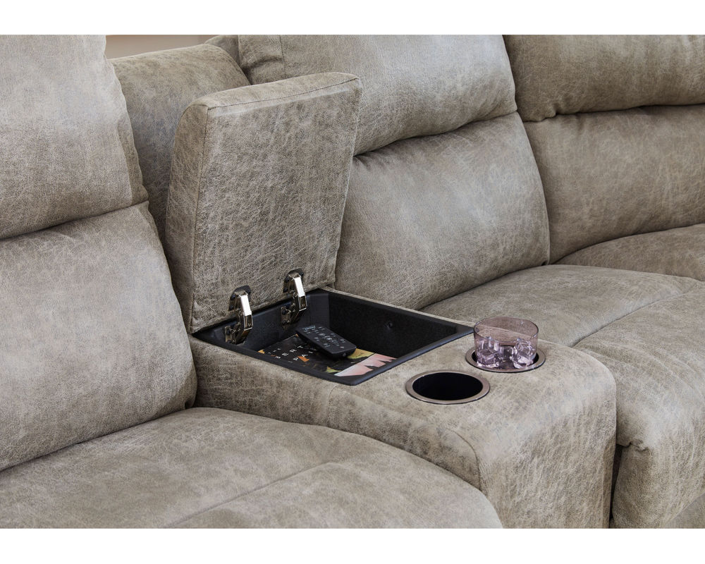 Binge-watch your favorite series in style and comfort with the Bodie theater sectional. Add as many seats as you wish to fit your space. The outside arm recliners feature a reclining handle, while the armless recliners feature an inside handle. Upgrade to power and relax at the push of a button - plus enjoy the convenience of a built-in USB charging port. The power armless recliners have a tethered hand wand. The console wedges offer storage of your remotes or magazines and feature two cupholders, and the option of a soft-close bottom drawer.
