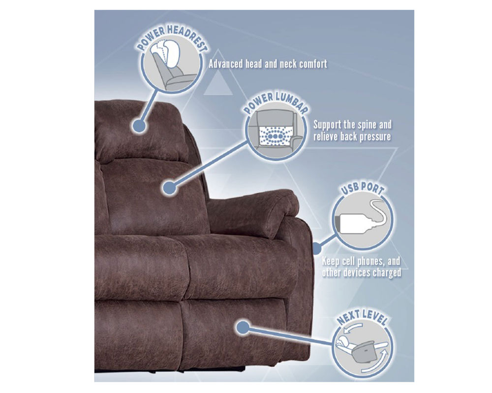 Includes Triple Power - Power Recline, Power Headrest, and Power Adjustable Lumbar with USB Charging.