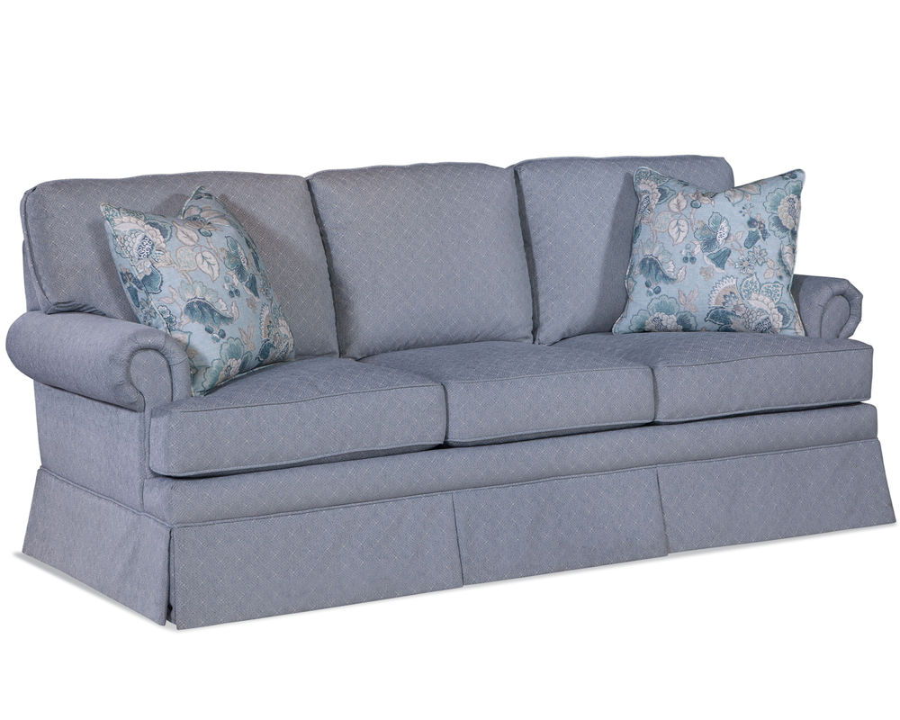 Grand scale styling and comfort is built into the Bradbury Sofa. Features rolled arms, T seat and back cushions and a tailored skirt. Includes our upgraded Comfort Spring seat cushion - handcrafted and features individually wrapped coil springs laminated top and bottom to a high performance polyurethane foam. Superb seating comfort with an average of 42 coils per seat. Over 800 fabrics available.