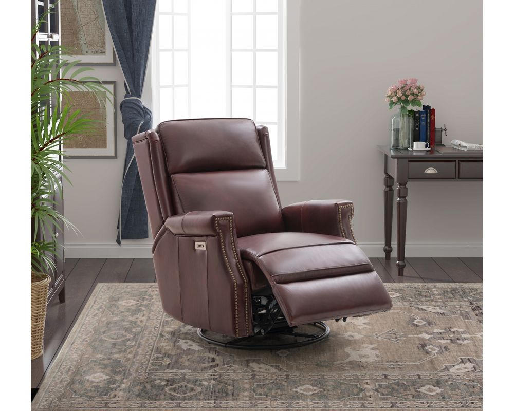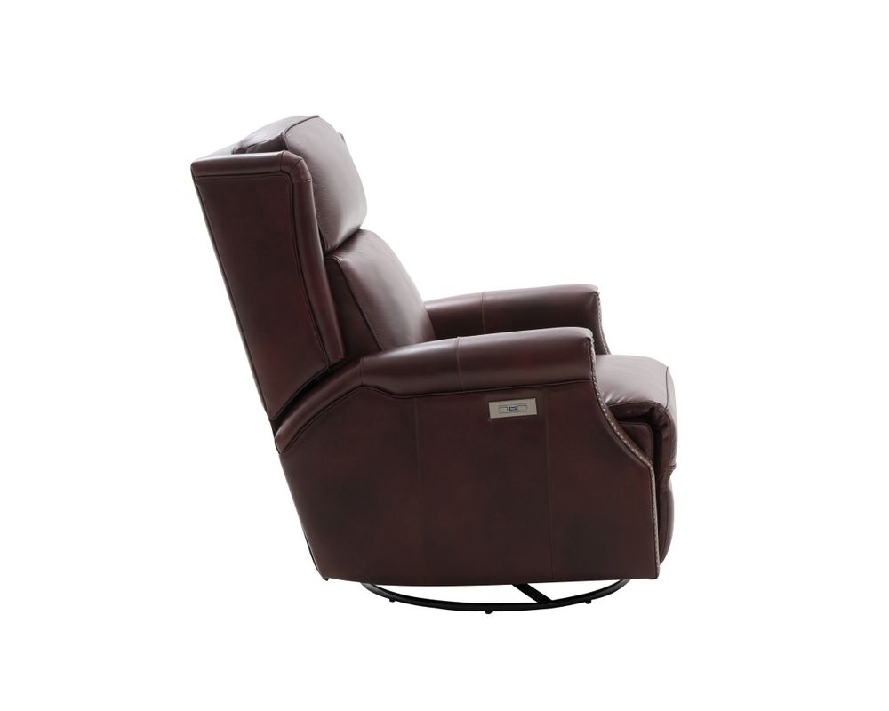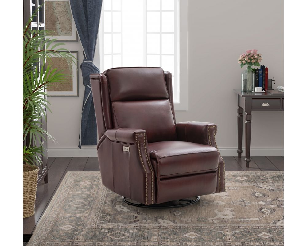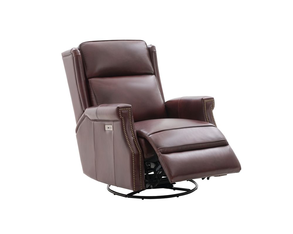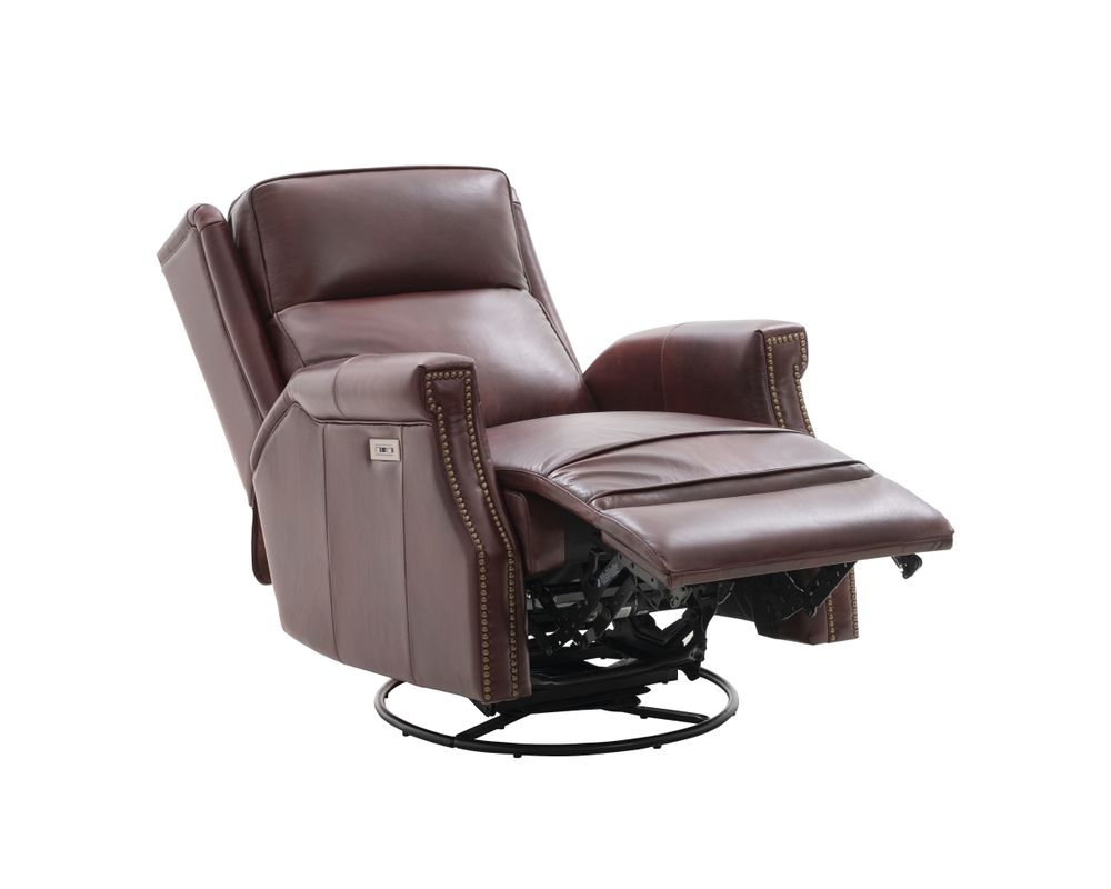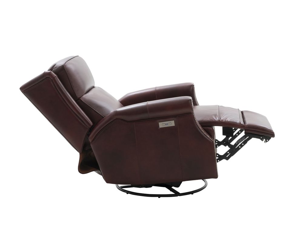 Smaller scale classic kneed back key arm swivel glider with power recline and power headrest. Winged pub back, boxed seat styled pad over chaise seating with pocketed coil springs encased in foam, wrapped in Dacron with a feather down blend topper. Nail head trim accents on arms and wings. USB port.