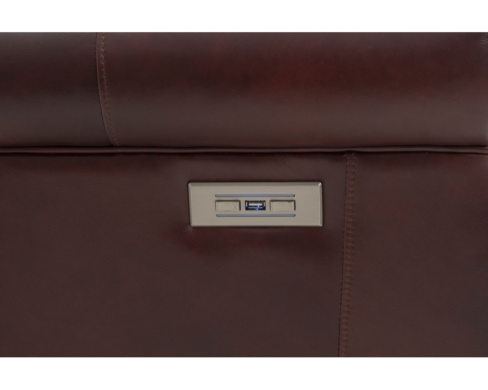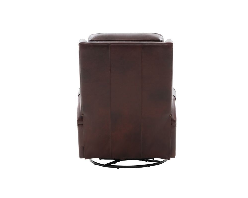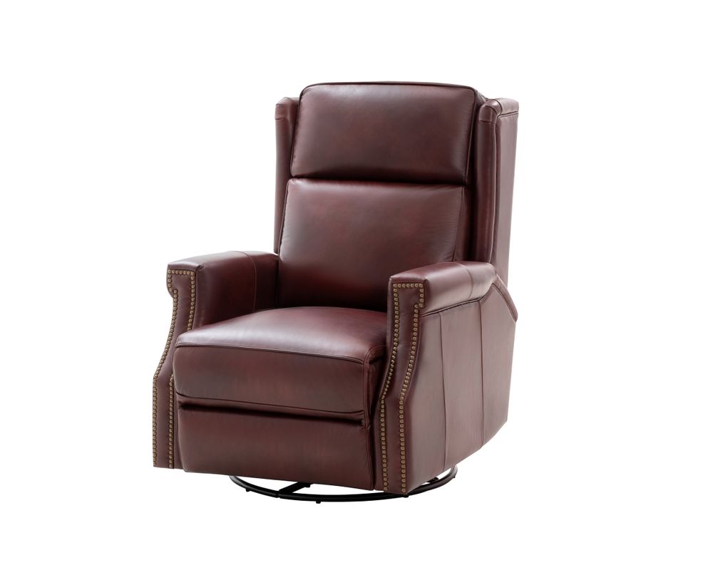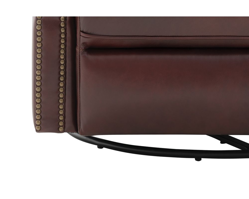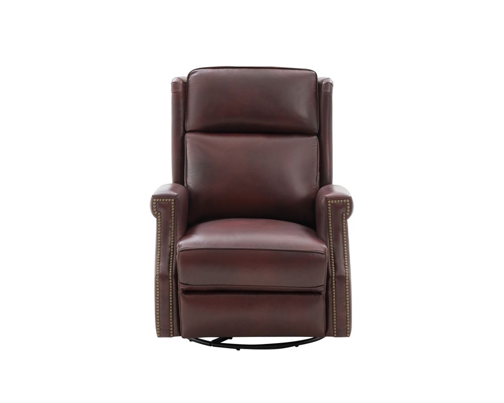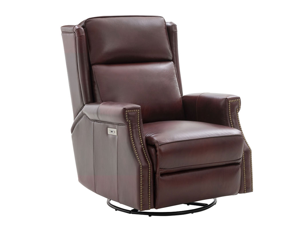 Smaller scale classic kneed back key arm swivel glider with power recline and power headrest. Winged pub back, boxed seat styled pad over chaise seating with pocketed coil springs encased in foam, wrapped in Dacron with a feather down blend topper. Nail head trim accents on arms and wings. USB port.