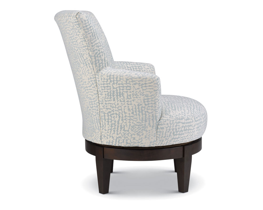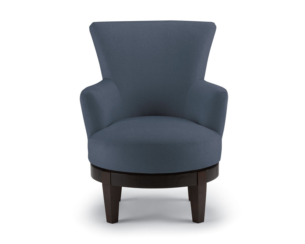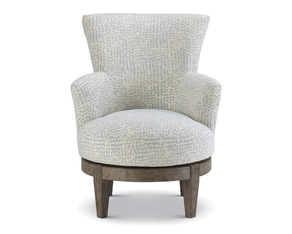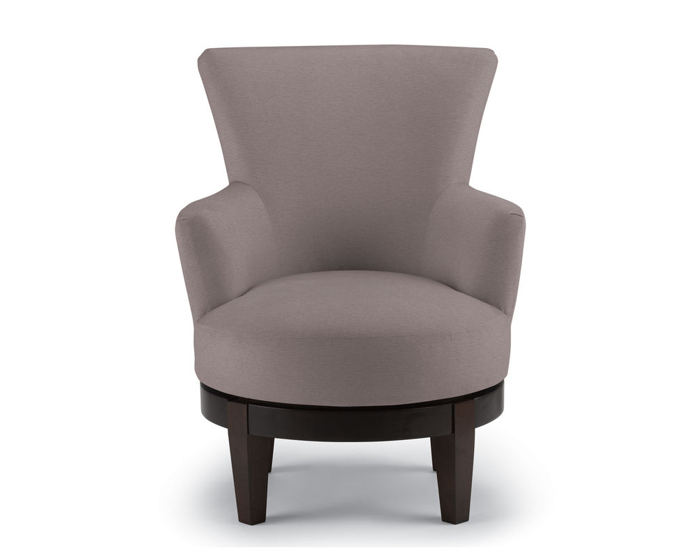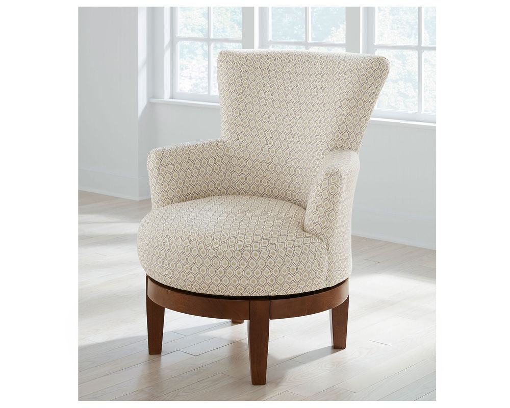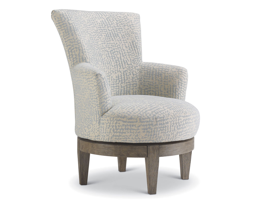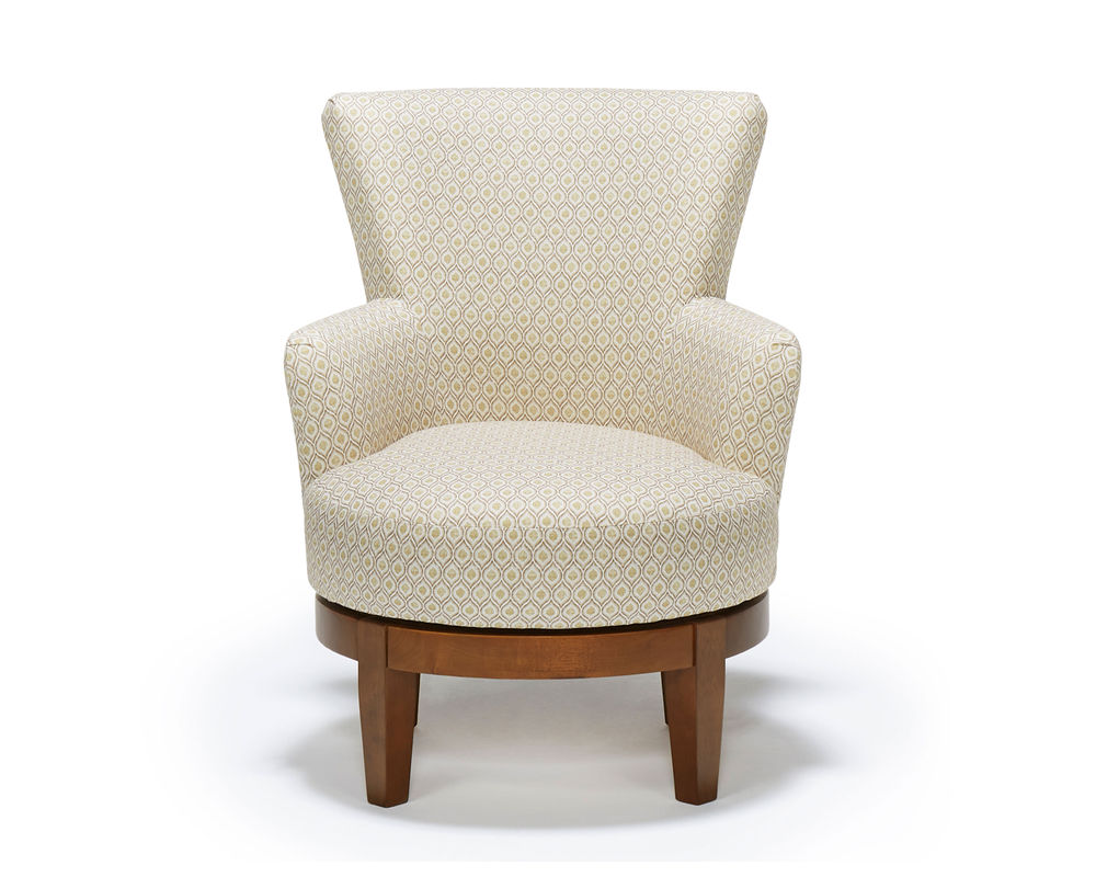 This exquisite Justine 2969 Swivel Chair is sure to add a touch of luxury and sophistication to any room. Featuring a regal 360-degree swivel design, the chair's high back and flared ends create an impressive silhouette. The chair's circular cushion is set atop a solid wooden base and legs, available in three finish options. To complete the look, you can choose from hundreds of covering options, ranging from stylish patterned fabrics to vibrant solid colors. With this chair, you can make a statement in any room.