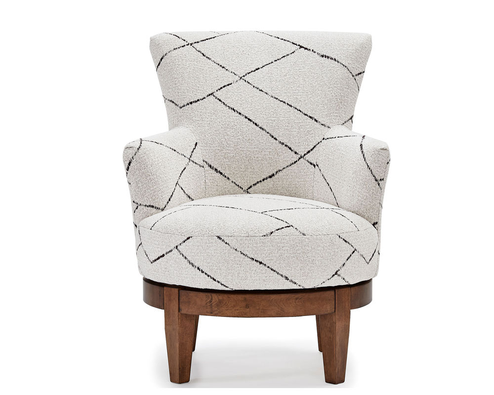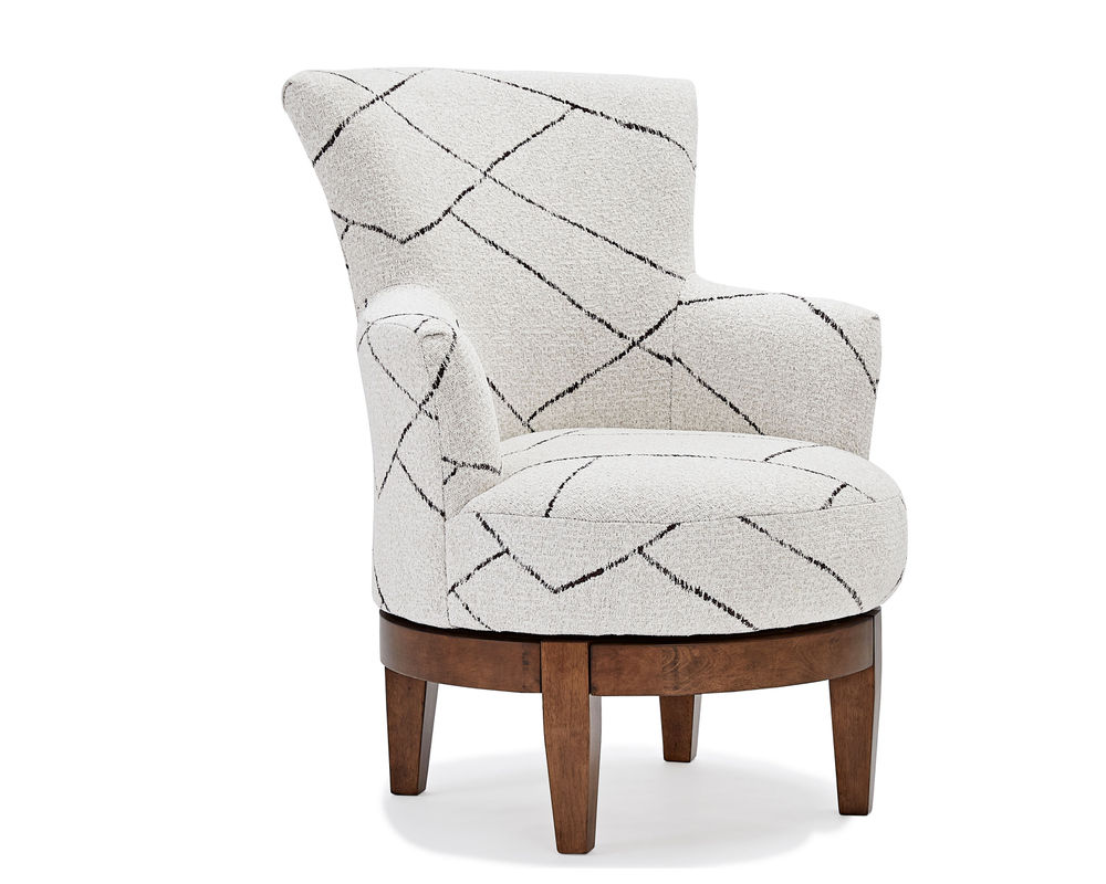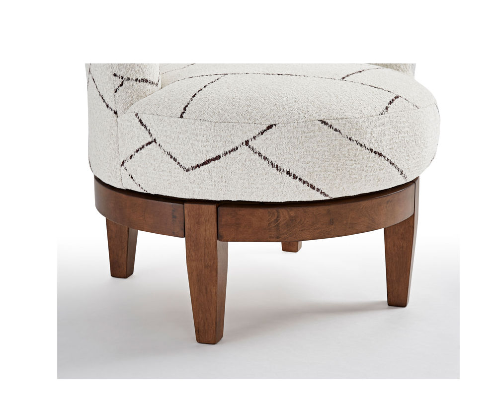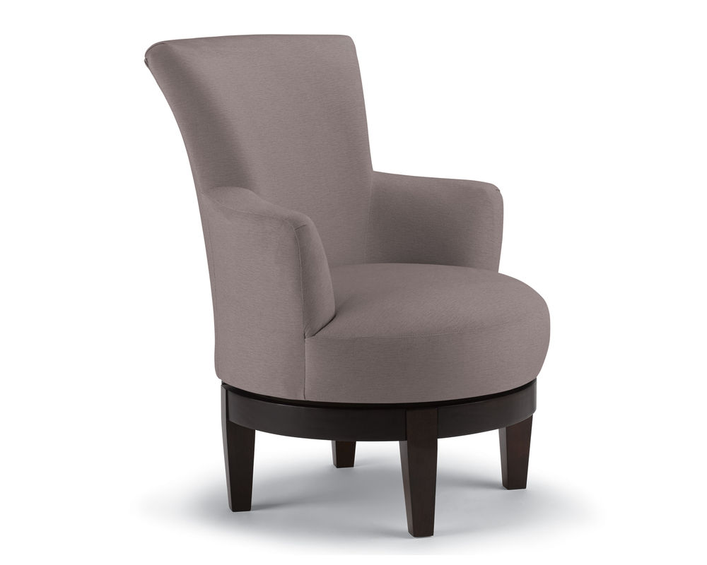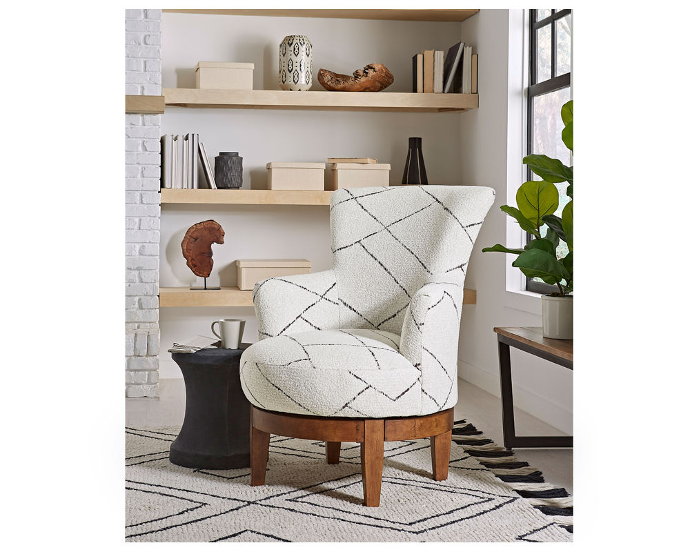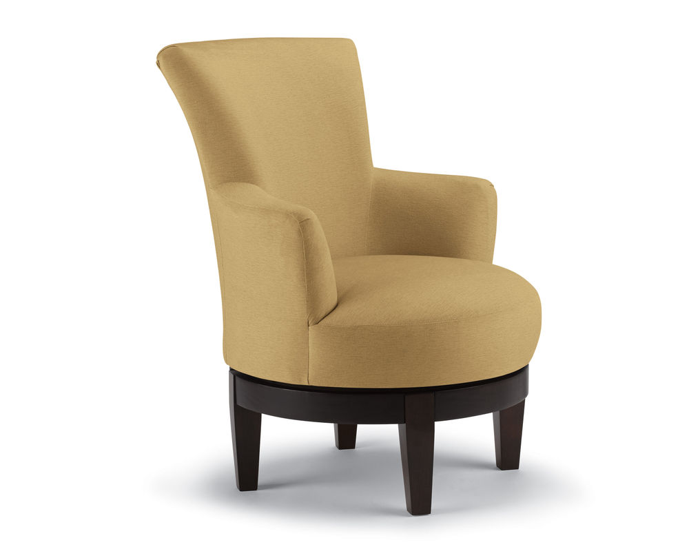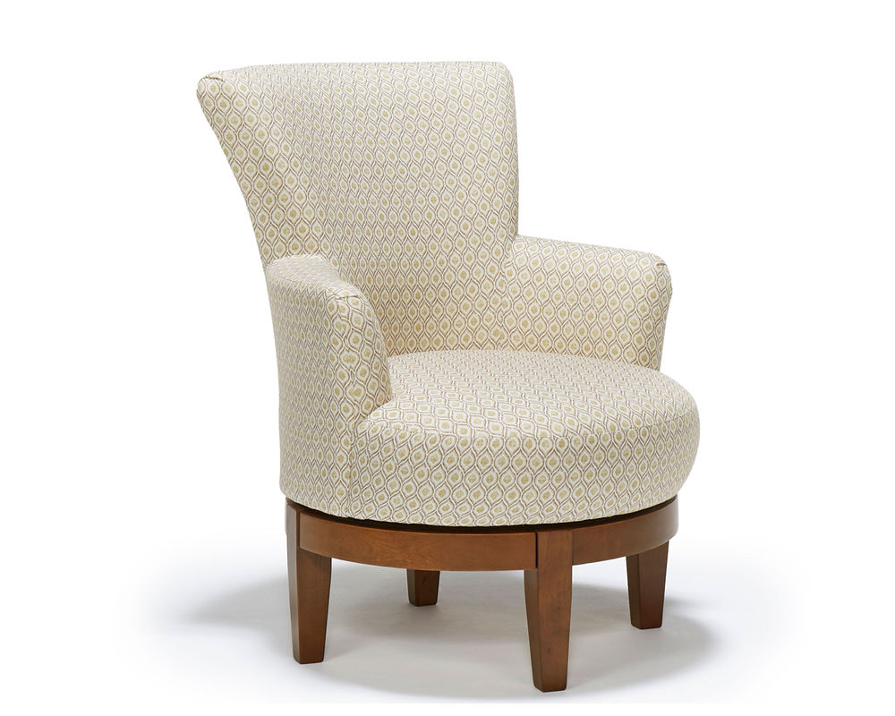 This exquisite Justine 2969 Swivel Chair is sure to add a touch of luxury and sophistication to any room. Featuring a regal 360-degree swivel design, the chair's high back and flared ends create an impressive silhouette. The chair's circular cushion is set atop a solid wooden base and legs, available in three finish options. To complete the look, you can choose from hundreds of covering options, ranging from stylish patterned fabrics to vibrant solid colors. With this chair, you can make a statement in any room.