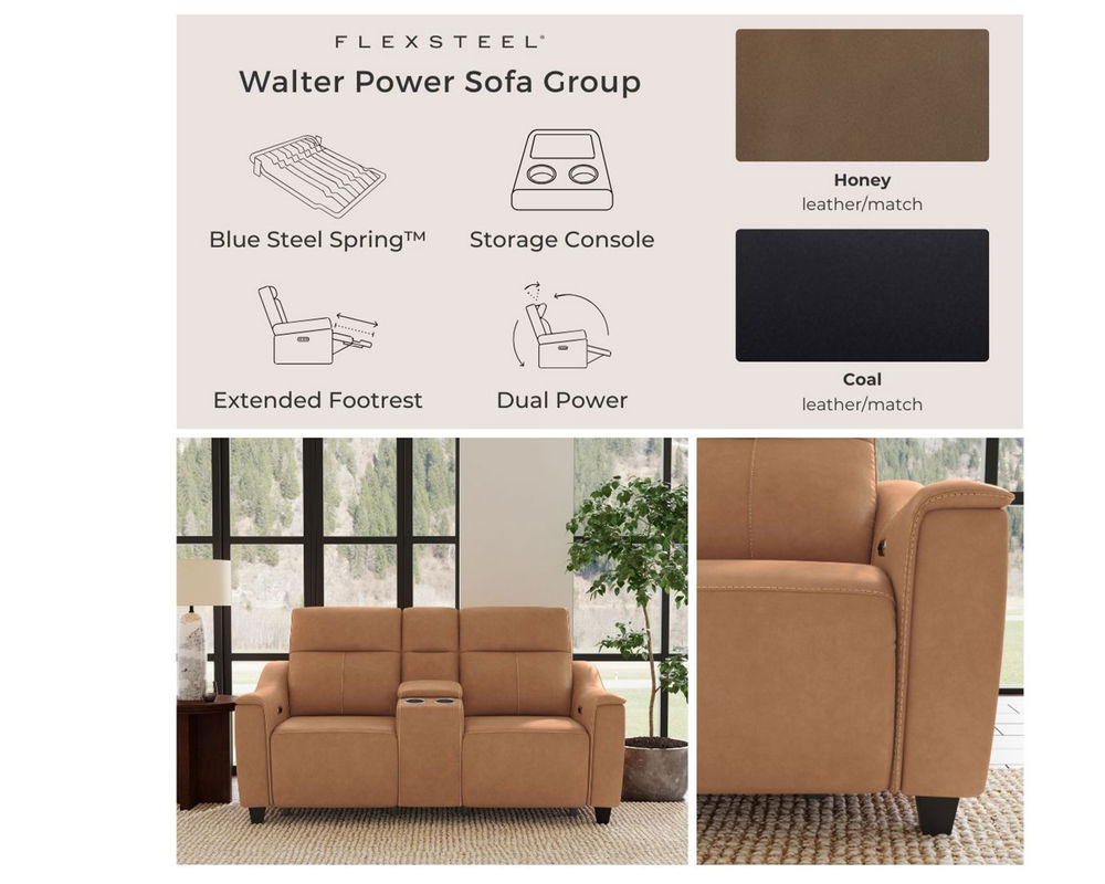 The Flexsteel Walter 1125 Console Reclining Loveseat is the perfect addition to any modern living space. With thin, pad-over sloped track arms, square tapered legs, and flat seats, this loveseat seamlessly blends modern style with motion technology. It features adjustable recline, powered headrests, and extended footrests, allowing you to customize your comfort level. High, divided backs support your shoulders, while convenient built-in ports make it easy to charge your devices. Plus, it has a handy console for storing drinks and remotes. Available in two colors of durable leather, this Walter power reclining loveseat is designed to stand the test of time. Add it to your home today and experience luxurious comfort and sophisticated style.
