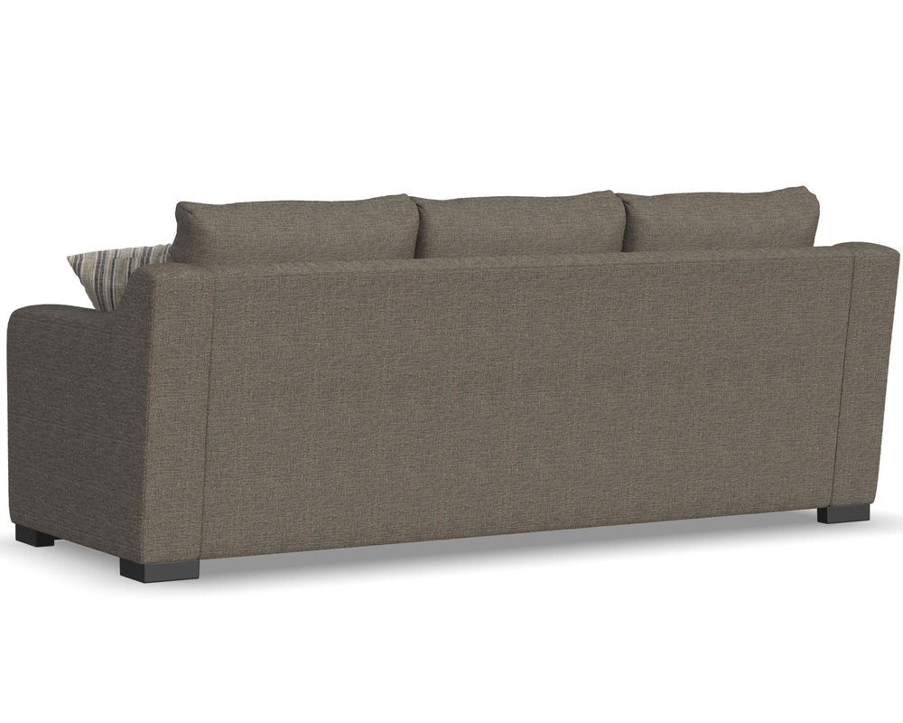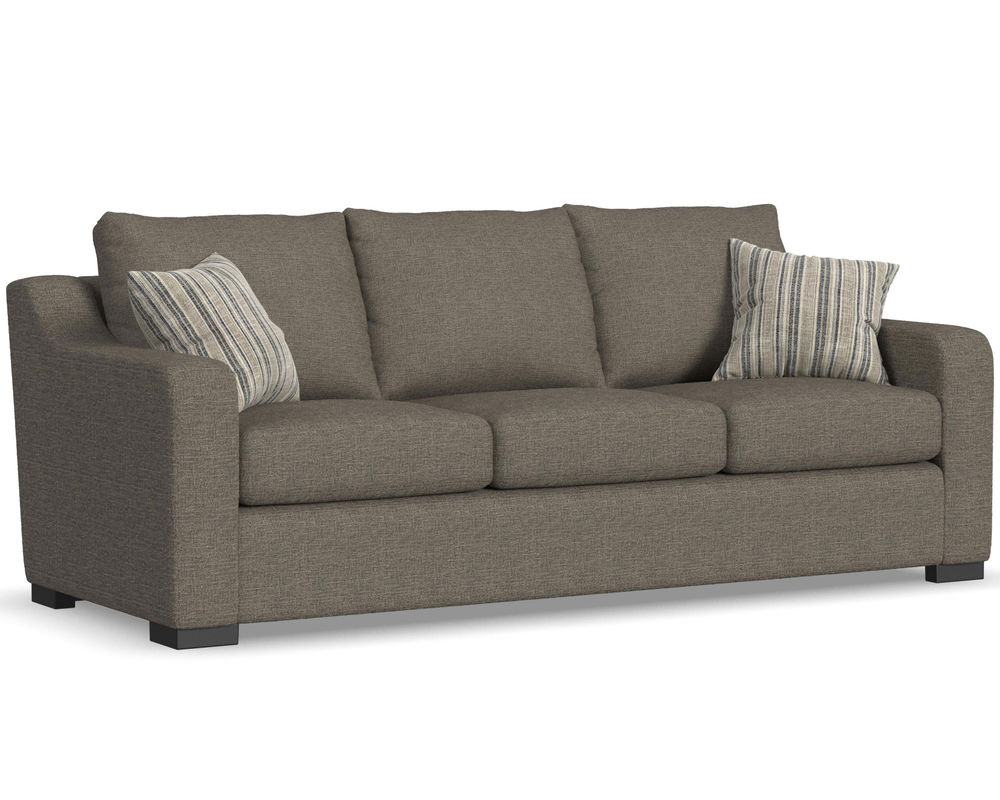 The Flexsteel Quinn 5802 Sofa is a stylish and comfortable seating solution for your living space. Featuring striking sloping track arms and complimenting wood feet in a dark espresso finish, this sofa is sure to add sophistication to any room. The back and seat cushions are reversible and available in over 100 performance and standard fabrics, so you are sure to find a style that suits your needs. It also includes two throw pillows for added comfort and convenience. Flexsteel is at the heart of quality furniture - a blue steel seat spring designed to last for years of use. With its timeless design and superior comfort, the Flexsteel Quinn 5802 Sofa is the perfect addition to any home.